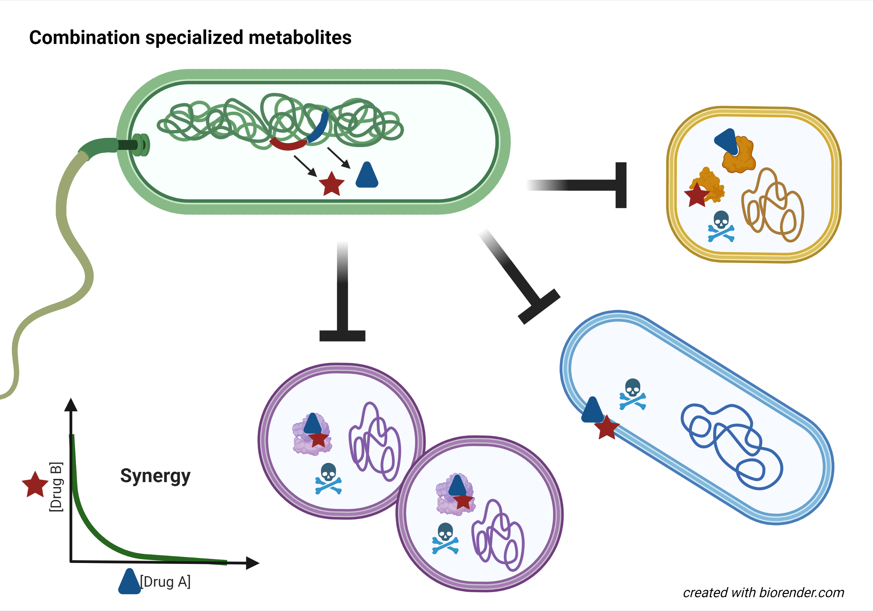 A human gut microbiome Bacillus isolate produces two RiPP peptides that work together to puncture and kill Clostridium difficile1. An amoeba-associated Pseudomonas produces a lipopeptide that enhances the activity of the co-produced tRNA synthetase inhibitor mupirocin, resulting in synergistic inhibition of methicillin-resistant Staphylococcus aureus2. A terrestrial cyanobacterium from a limestone cave uses a branched synthetic pathway to produce two related macrocycles, which together have synergistic antifungal activity3. These are just some of the examples of combination specialized metabolites that captured my imagination as I spent my Covid-19 lockdown digging through the literature. As a pharmacologist and microbiologist, I find these naturally occurring antimicrobial synergistic combinations intriguing. How common are they? How do they work? And can they help us counter the crisis of antimicrobial resistance?