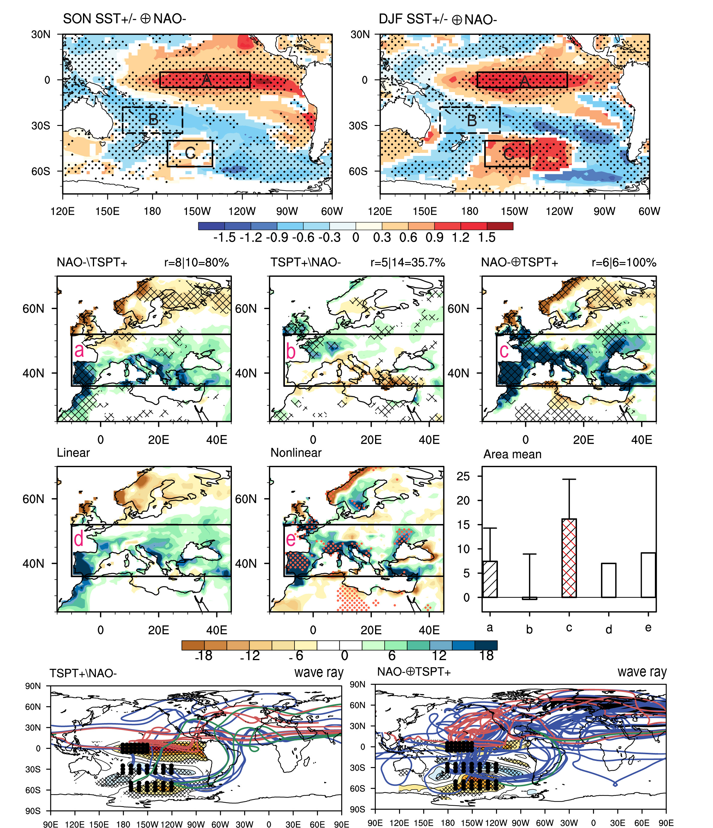 Figure 1. Schematic diagram illustrating the synergistic effect of NAO- and TSPT+ on SEWP. The first row shows the SON (left) and DJF (right) SSTA+ (-) when NAO- with SSTA+ (-) contributes to stronger SEWP than that with SSTA- (+). The second and third row shows the composite anomalies of DJF precipitation during the isolated and joint events of TSPT+ and NAO-. The third row shows the linear superposition of isolate responses of TSPT+ and NAO-, and nonlinear response of TSPT+ and NAO- on DJF precipitation, and area mean values of SEWP are shown in bars. The fourth row shows the stationary Rossby wave rays related to TSPT+ and NAO- during TSPT+\NAO-, and NAO-⊕TSPT+.