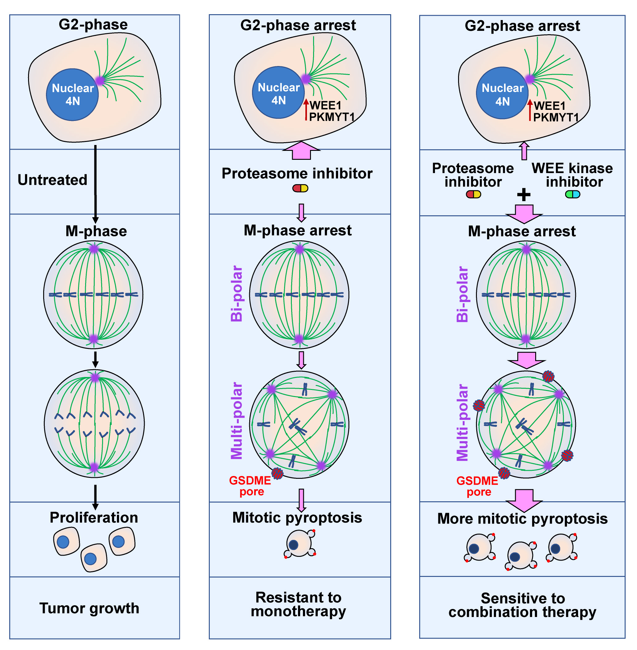 Induction of mitotic catastrophe (MC) is considered as an attractive strategy to selectively kill cancer cells1,2. The reported modes of cell death under MC are often attributed to intrinsic apoptosis3,4. Whether pyroptosis, a newly defined mode of cell death5, is involved in MC remains unreported. During mitosis phase (M-phase), both transcription6 and translation7 of mRNAs are globally repressed, the proteasome-mediated protein degradation thus plays important roles in regulating M-phase8. Bortezomib (BTZ) is the first proteasome inhibitor approved to treat human cancers, like multiple myeloma and mantle cell lymphoma, but primary resistance to BTZ in solid tumors limits its clinic use9. To date, whether and how proteasome inhibitor affected the fates of cells in M-phase remains unexplored. The inhibitors of G2 checkpoint activators, like WEE family kinases and CHK1/2 display high toxicity and low efficacy10, resulting in termination of further clinical development. Whether these inhibitors can synergize with proteasome inhibitor in killing cancer cells is still unknown.