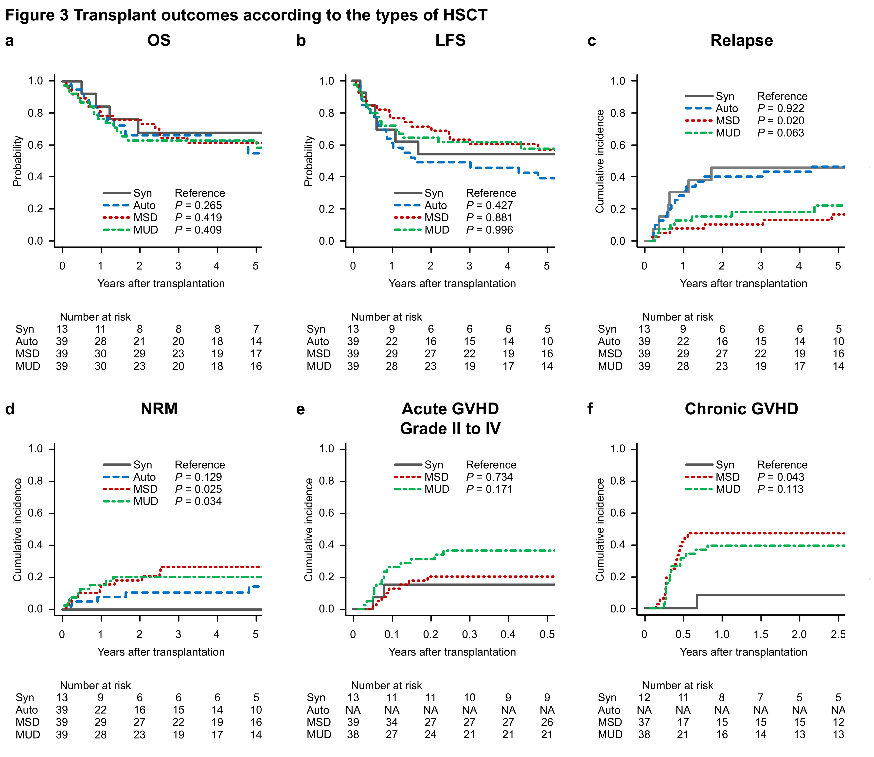 Transplant outcomes per donor group are shown in Figure 3. The 5-year OS rates after HSCT were 68.4% (95% CI, 35.9–86.8%; reference) in the Syn group, 55.9% (95% CI, 37.2–71.0%; P = 0.265) in the Auto group, 62.4% (95% CI, 44.8–75.8%; P = 0.419) in the MSD group, and 63.7% (95% CI, 46.5–76.7%; P = 0.409) in the MUD group (Figure 3a). The 5-year LFS rates after HSCT were 53.8% (95% CI, 24.8–76.0%; reference) in the Syn group, 38.6% (95% CI, 22.6–54.5%; P = 0.427) in the Auto group, 56.6% (95% CI, 39.0–70.9%; P = 0.881) in the MSD group, and 57.1% (95% CI, 39.4–71.5%; P = 0.996) in the MUD group (Figure 3b).