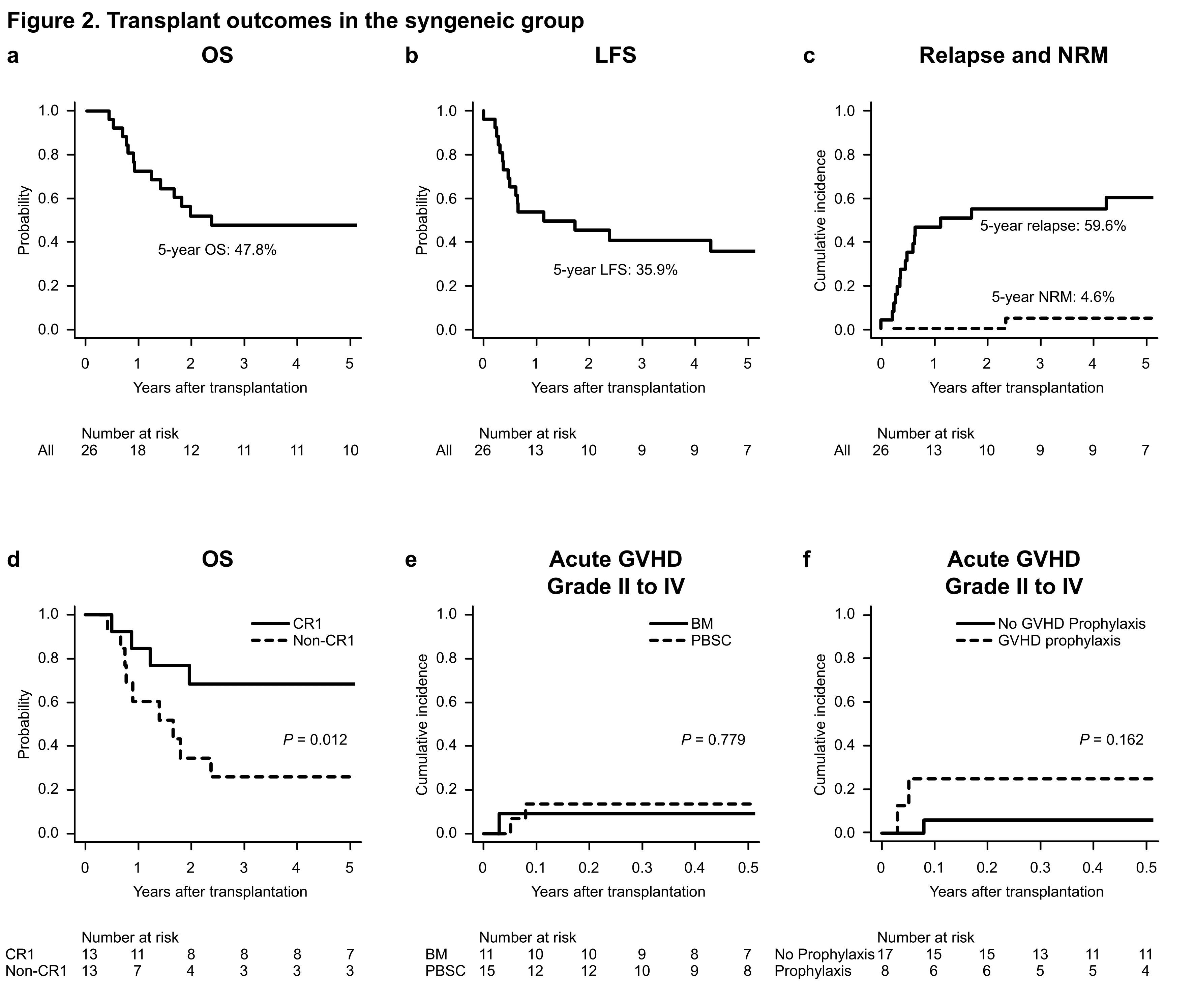 In conclusion, this is the first study to assess prognostic factors in patients with AML after syngeneic HSCT and compare the outcomes of syngeneic HSCT with those of autologous or allogeneic HSCT for patients in CR1. Our findings suggest that syngeneic HSCT might offer an alternative curative option for AML. Data from a larger number of patients and prospective studies are needed to clarify the role of syngeneic HSCT in the treatment of AML.
