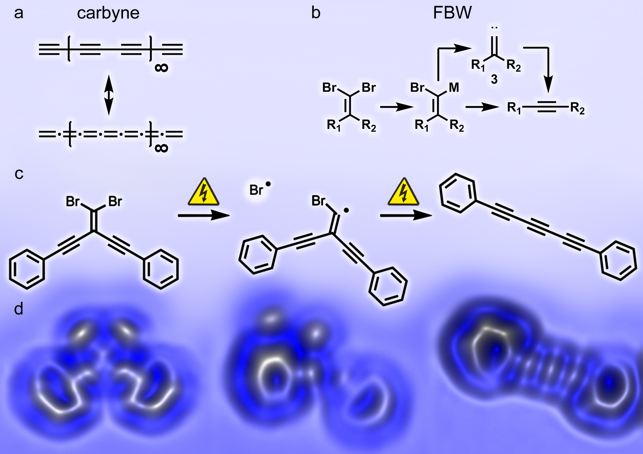 Figure 1. a) Carbyne in polyyne (top) and cumulene (bottom) forms; b) FBW rearrangement; c) Reaction of the first model system; d) AFM images of all steps of rearrangement on surface.