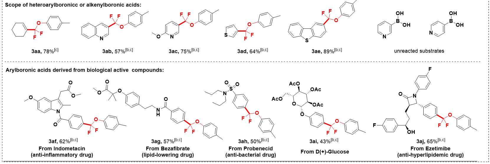 Herein, we reported a Ni-catalyzed Suzuki cross-coupling reaction by using aryloxydifluoromethyl bromides (ArOCF2Br) as a unique halide species to undergo coupling with arylboronic acids, leading to highly efficient synthesis of various aryl aryloxydifluoromethyl ethers (Figure 2). The reaction showed wide substrate scope in both substrates containing various functional groups, and allowed late-stage difluoromethylation of many pharmaceuticals and natural products (Figure 2).