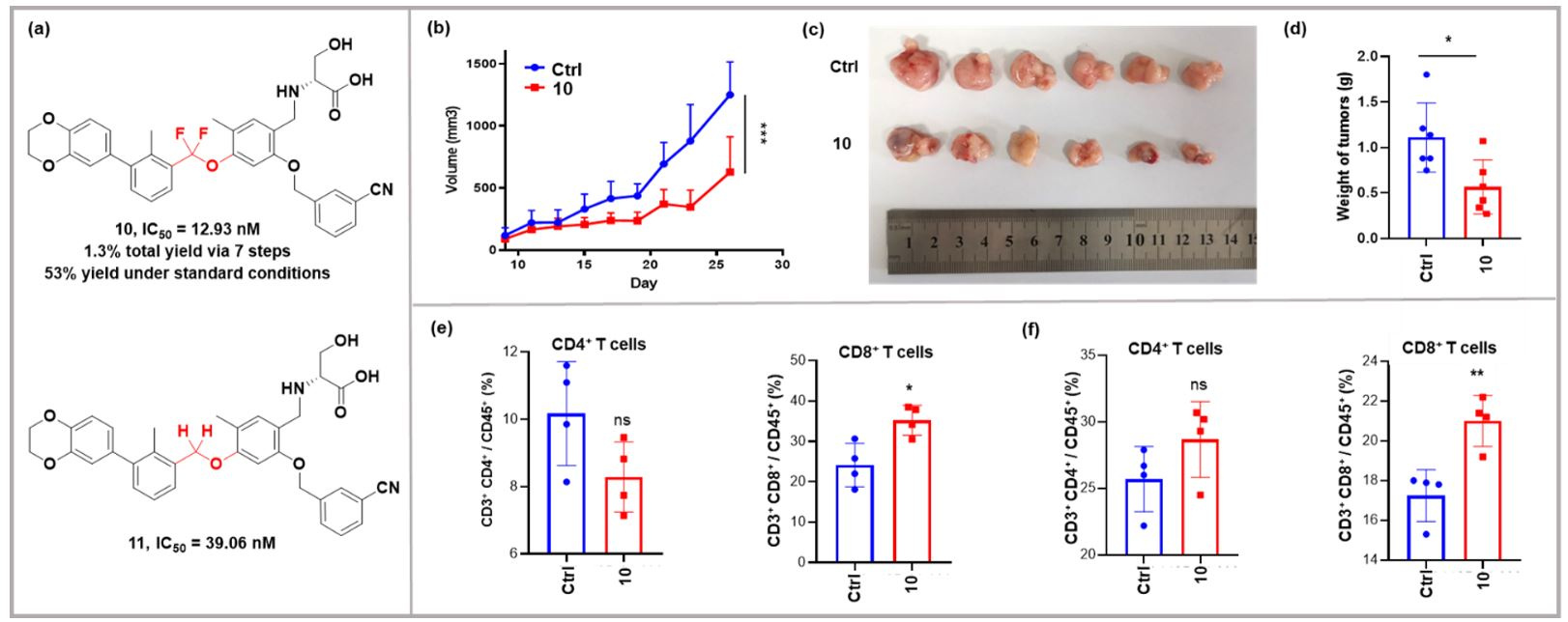 With the encouraging results, we succefully prepared a new difluoromethylated PD-1/PD-L1 checkpoint inhibitor 10 via 7 steps with good efficiency by using the coupling reaction as the key step. The diaryldifluoromethyl ether key intermediate D (Figure 1b) was obtained in 53% yield under standard conditions, which was much better than traditional method in our previous report (less than 10% yield). As shown in Figure 3a, compared to the non-fluoro precedent 11, difluorinated 10 showed three-fold higher potency against PD-1/PD-L1 interaction (IC50 for 10/11: 12.93 vs 39.06 nM). In vivo, inhibitor 10 displayed a significant reduction in tumor burden than control group with no significant loss of body weight or other common toxic effects in MC38 subcutaneous transplanted tumor model (Figure 3b,c,d). Furthermore, to explore the effect of 10 on tumor immunity, we measured the percentage of T lymphocytes in tumors and spleens of mice treared with 10. As shown in Figure 3e and 3f, injection of 10 significantly increased the population of CD8+ T cells in both tumors and spleens, which indicated that 10 activated antitumor immune response in MC38 xenograft model.