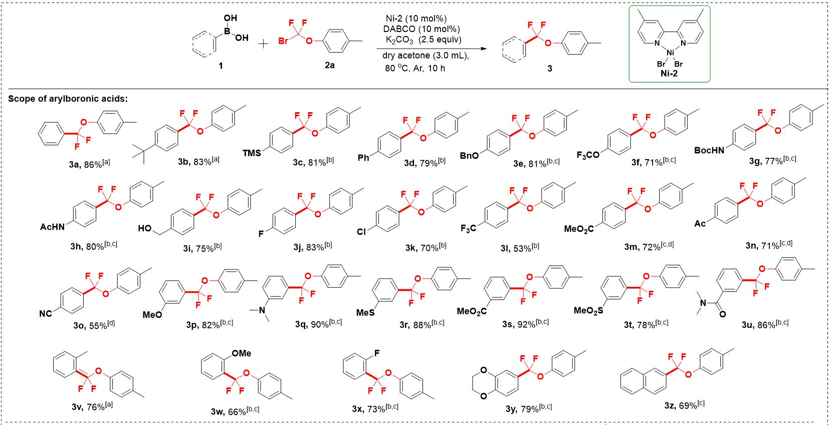 Fig. 2 Ni-catalyzed aryloxydifluoromethylation reactions with diversified arylboronic acids. (a) Reaction conditions: unless otherwise noted, a solution of 1 (0.2 mmol), 2a (0.4 mmol), Ni-2 (10 mol%), DABCO (10 mol%), and K2CO3 (0.5 mmol) in dry acetone (3.0 mL) was performed at 80 oC under argon for 10 h. The yields are isolated yields by column chromatography on silica gel. (b) Dry acetone (2.5 mL) and DMF (0.5 mL) were used for solvent. (c) 100 mg 4A MS was added. (d) Dry acetone (1.5 mL) and DMF (1.5 mL) were used for solvent.