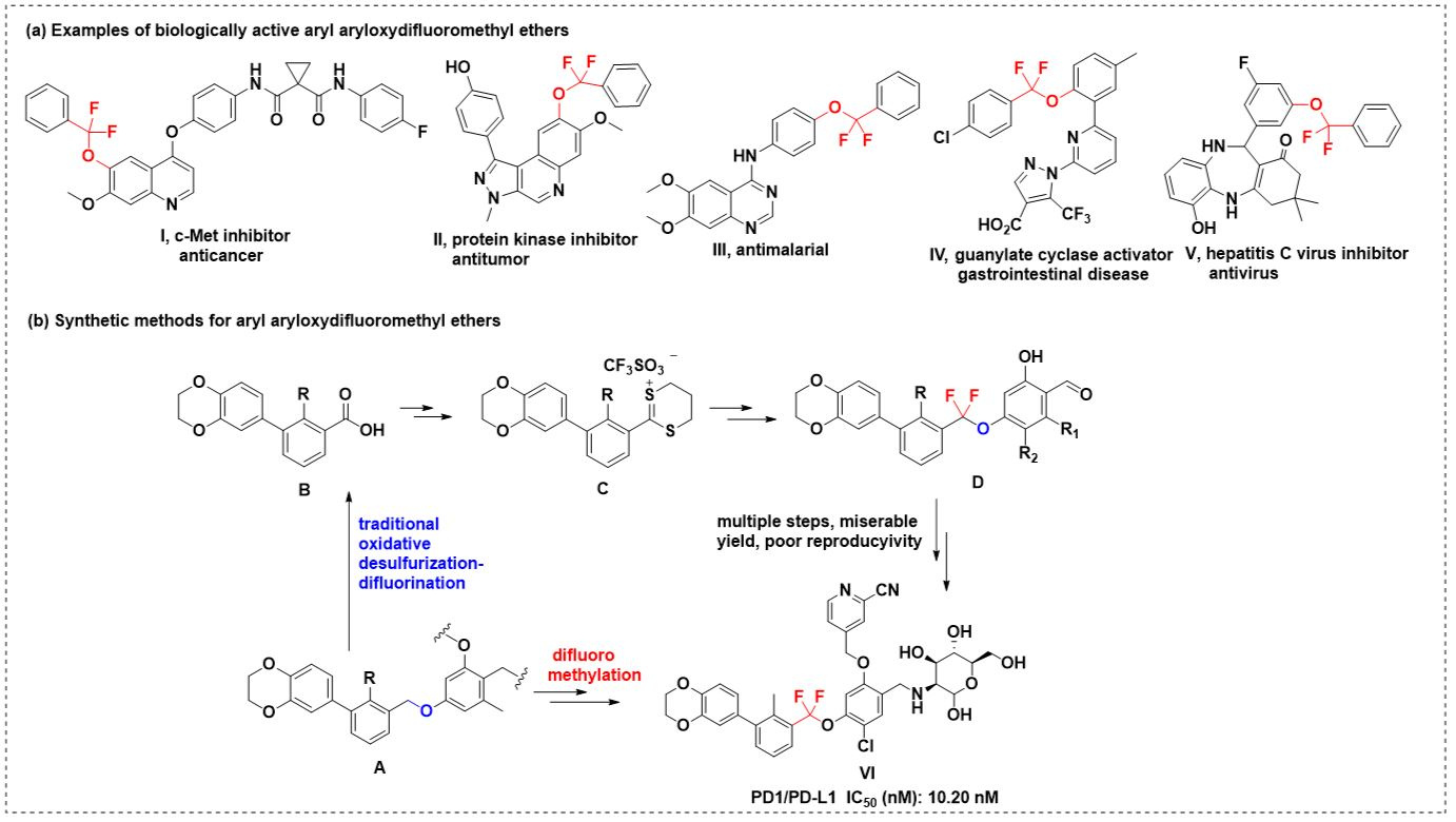 Fluorine-containing drug molecules approximately account for over 30% of the total marketed drugs and crossing diverse disease indications.[1] It is noteworthy that gem-difluoromethylated groups have gained tremendous importance in the field of drug discovery due to the capability of difluoromethyl motif both in creating new patentable intellectual property and in improving druglike properties.[2] Among these, the aryldifluoromethyl aryl ether module (ArCF2OAr') has attracted extensive applications recently due to its optimal metabolic stability against benzylic oxidation by CYP450 enzyme in liver and similar or slightly improved biological activity, compared to the non-fluorinated precursors ArCH2OAr' (Figure 1a). Previously, our group has reported a series of PD-1/PD-L1 (Programmed death-1/programmed death ligand-1) inhibitors featuring a difluoromethyleneoxy linkage (Figure 1b).[3] However, key intermediates containing aryldifluoromethyl aryl ethers were difficult to prepare using traditional oxidative desulfurization-difluorination method (less than 10% yield). Therefore, development of a mild, substrate compatible, and site-selective method for convenient construction of ArCF2OAr' is highly desirable.