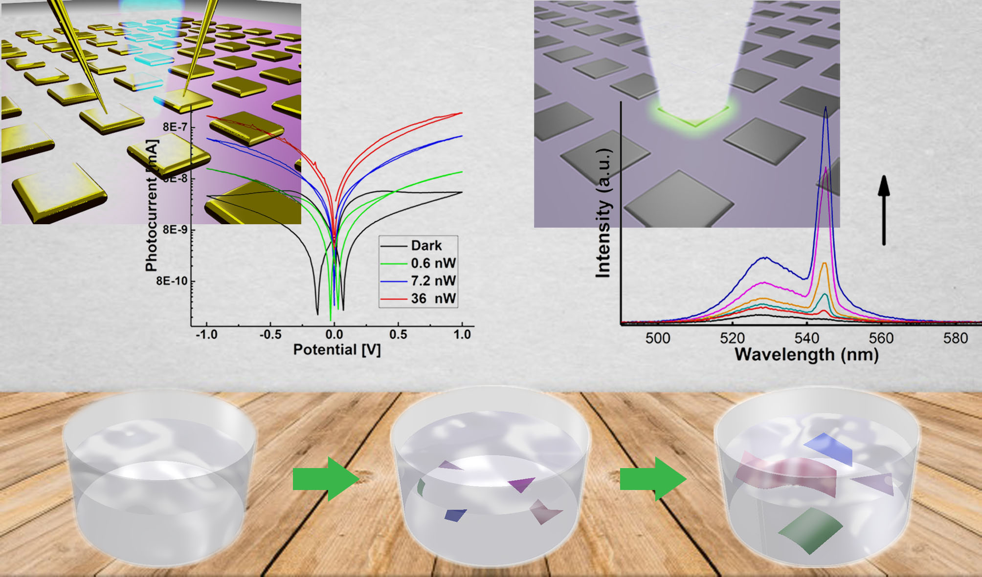 Figure: The PbBr2 nanosheets form easily in solution and grow over time to be 1 cm or more in diameter and less than 100 nm in thickness. Both photodiode and laser devices were fabricated once the PbBr2 was converted to perovskite materials.