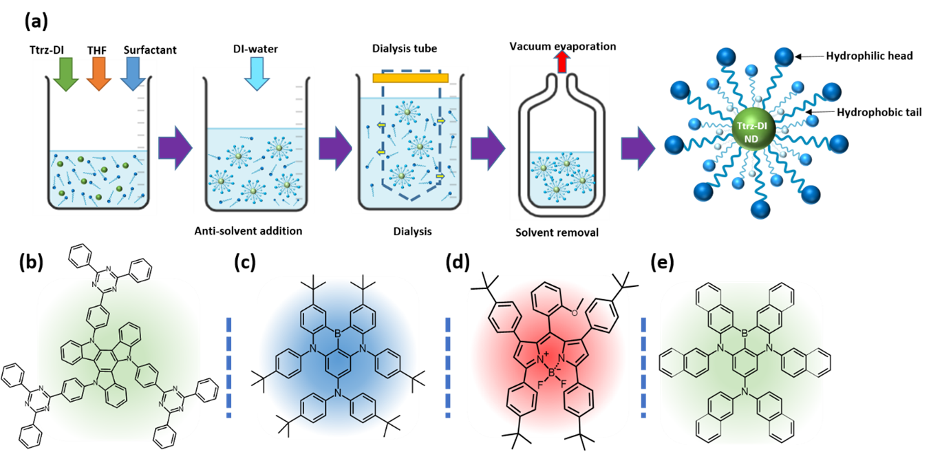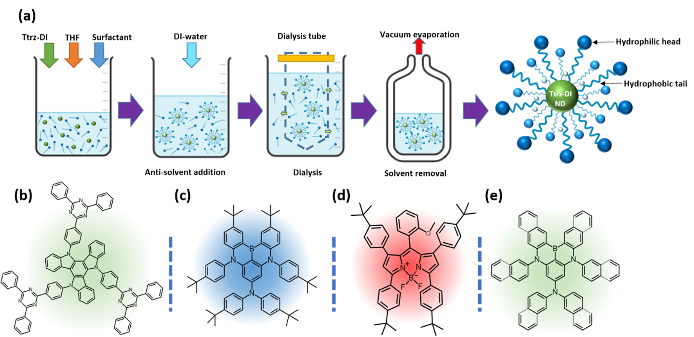 Figure 1. Schematic diagrams. (a) Synthesis process of Ttrz-DI nano-dot dispersion using surfactants. Chemical structures of (b) Ttrz-DI, (c) CzDABNA, (d) 4tBuMB (e) TNAP fluorescent materials. In (b) – (e), the background color corresponds to the emission color of each fluorophore.