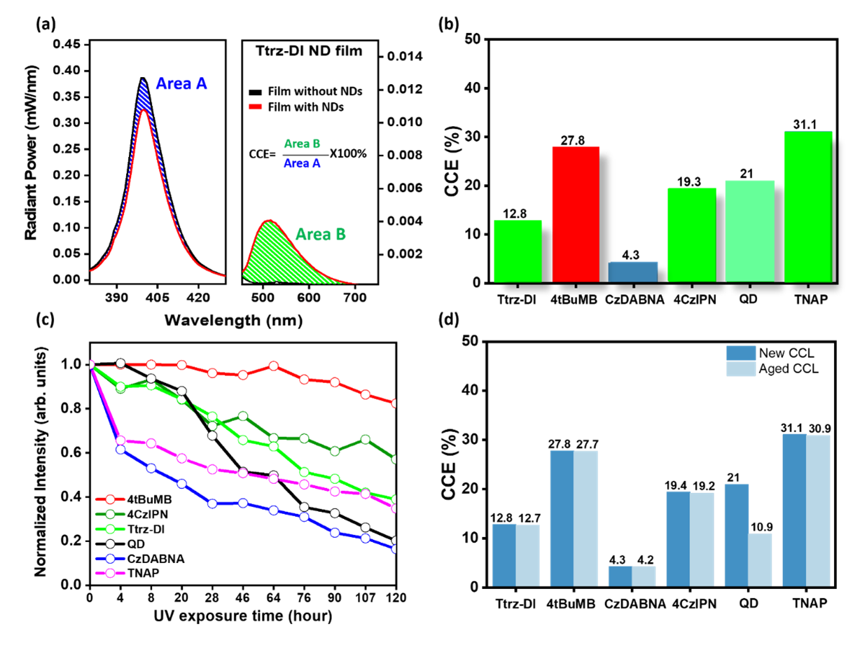 Figure 2. Color conversion characteristics. (a) Color conversion efficiency (CCE) of Ttrz-DI nano-dot films used as color conversion layers. (b) Color conversion efficiency comparison of 4CzIPN nano-dot film, Ttrz-DI nano-dot film, 4tBuMB nano-dot film and QD film. The color of each bar corresponds to the emission color of each fluorophore. (c) Stability test of nano-dot films under constant UV exposure. (d) Color conversion performance stability of new and aged films.