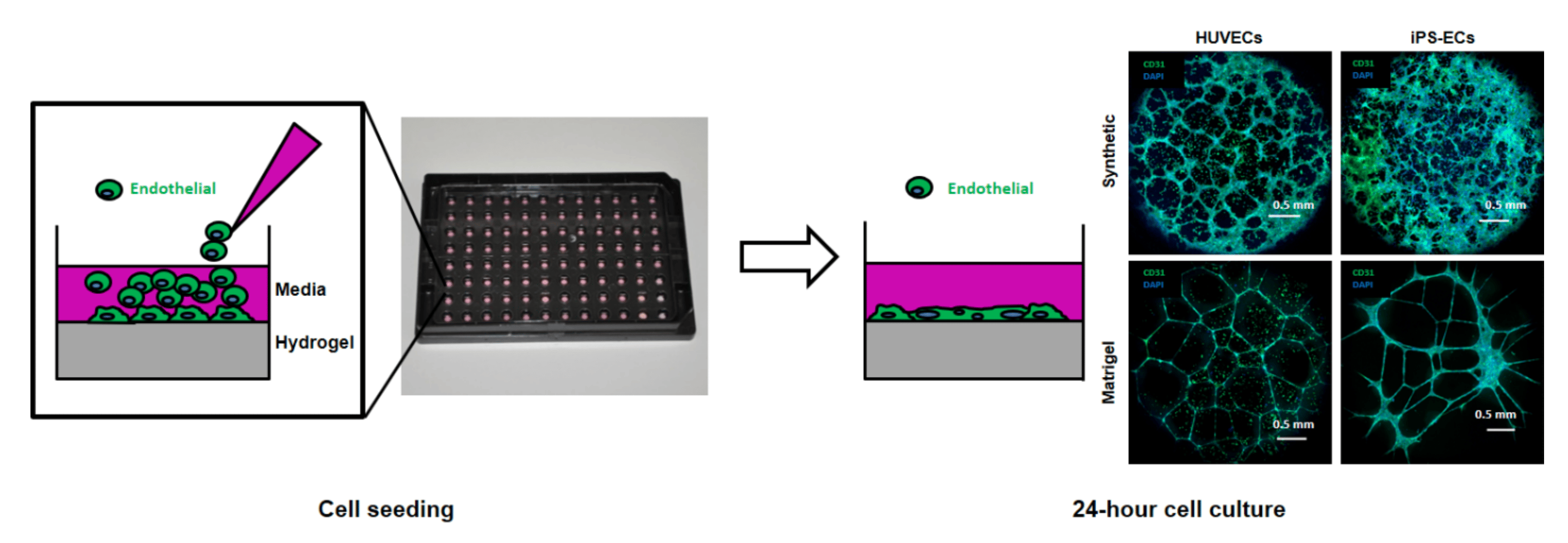 Figure 1. Seeding and confocal microscopy images of human umbilical vein endothelial cells (HUVECs) and human induced-pluripotent-stem-cell-derived endothelial cells (iPSC-ECs) forming networks on synthetic versus Matrigel substrates.