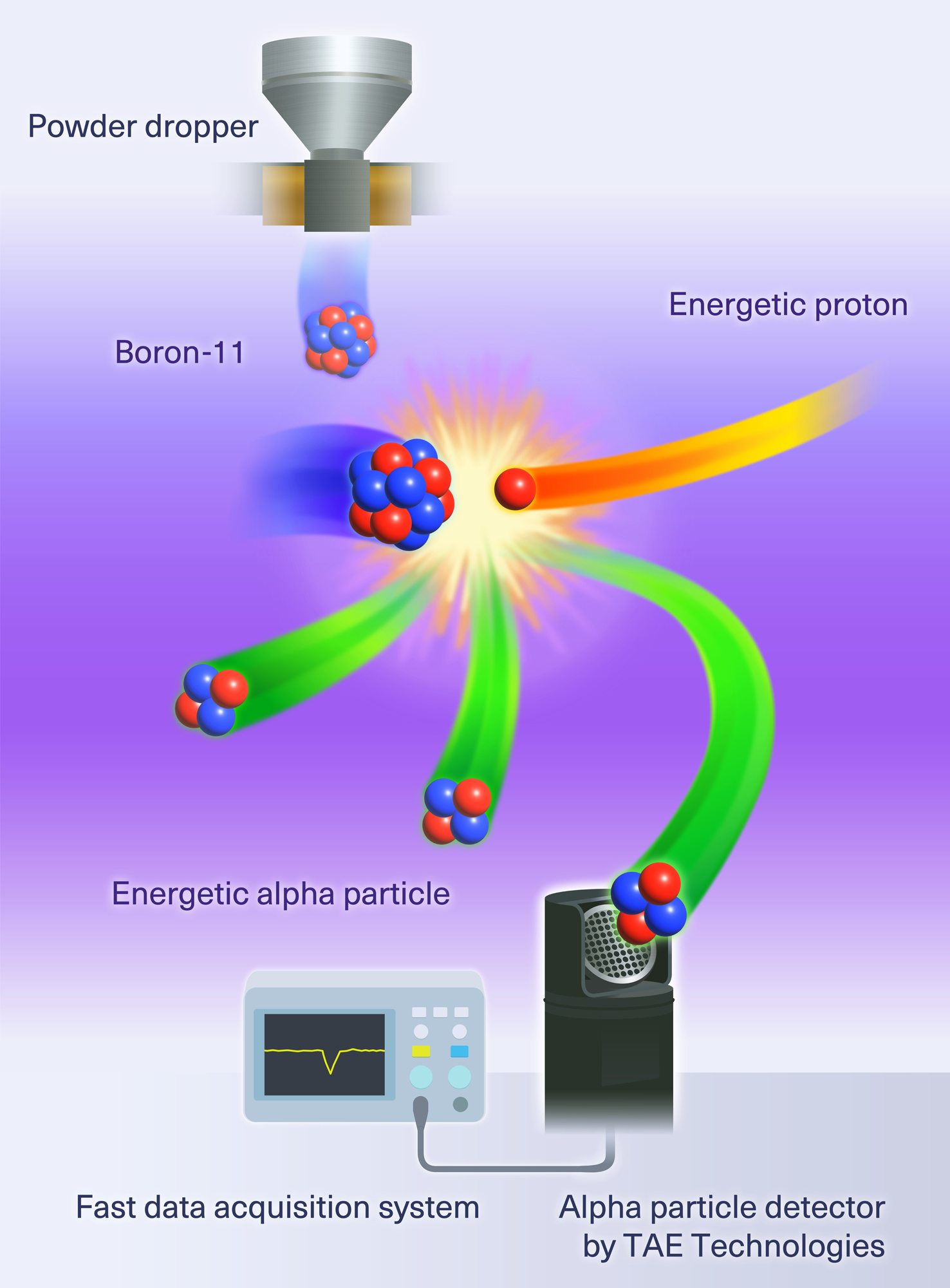 Serendipitously then, the necessary ingredients for p-B11 fusion – high energy protons and a boron target plasma – are created in the LHD (see Figure 1 for a rendering of the experimental set-up). Previous work by Ogawa et al1 calculated the expected rate of p-B11 fusion in the LHD plasma using the measured boron density and profile of fast ions as inputs. All that was needed was a detector to measure the products of the reaction.