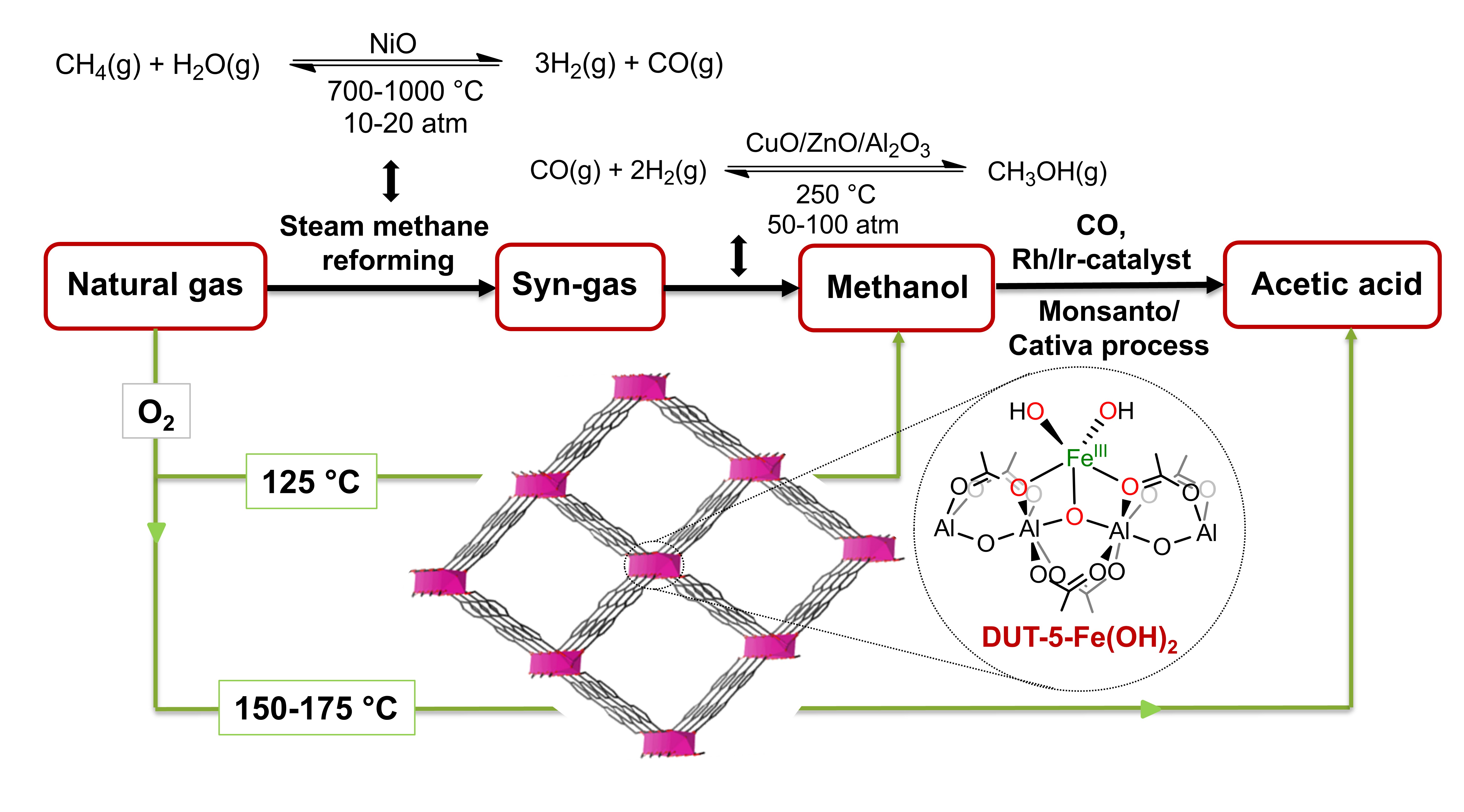The catalyst features a robust and porous 3D aluminum-DUT-5 framework, constructed from Al3+(µ₂-OH) nodes interconnected by 4,4’-biphenyldicarboxylate linkers. Post-synthetic grafting of Fe3+(OH)2 active sites at the μ2-OH nodes generates isolated iron centers that exhibit remarkable catalytic activity. Under mild aqueous conditions at 125 °C, the catalyst achieves a methanol productivity of 2.083 mmol gcat-1 h-1 with an impressive selectivity of ~ 90%, while limiting over-oxidized byproducts such as CO and CO2 to less than 5% selectivity. Mechanistic investigations reveal that the reaction proceeds via a FeIII–FeI–FeIII catalytic cycle, which involves the formation of methyl radicals, as confirmed by EPR, EXAFS, and DFT studies. The synergistic design of the DUT-5 framework and the site-isolated Fe3+(OH)2 active centers offer a sustainable, economically viable, and energy-efficient pathway for methane transformation, paving the way for industrial applications in the selective production of methanol and acetic acid.