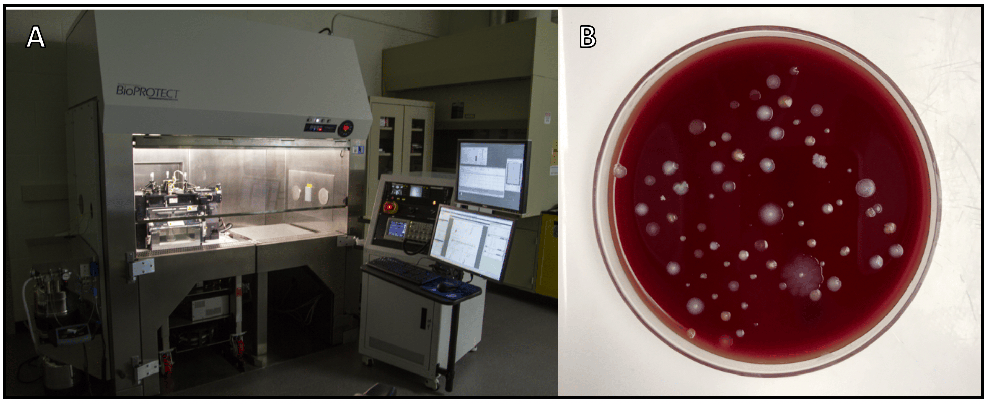 Figure 1. Flow cytometry enabled single-cell sorting for microbial cultivation. A. Flow cytometer system in a sterile hood allowing for the measurement of over 5000 cells per second to screen for taxa present at low abundance. B. Example of an agar plate with a 100 cell grid where each colony began from a single sorted cell or multiple cells attached to each other.