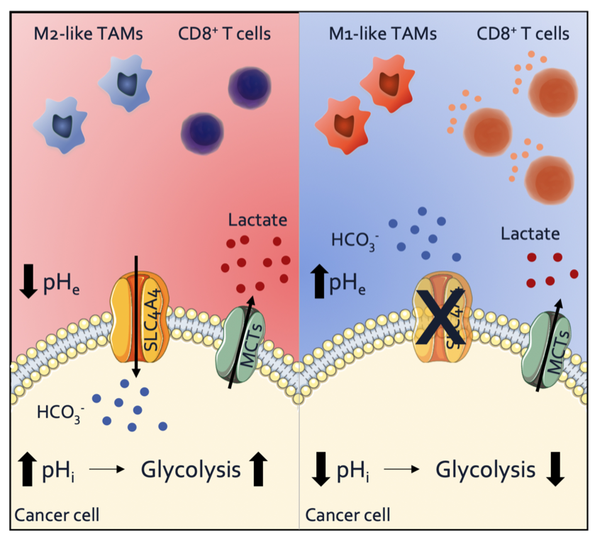 In PDAC-bearing mice, genetic or pharmacological targeting of SLC4A4 improves T cell-mediated immune response and breaches macrophage-mediated immunosuppression, thus inhibiting tumor growth and metastases. In addition, Slc4a4 targeting in combination with immune-checkpoint blockade is able to overcome immunotherapy resistance and prolong survival. Overall, our data propose SLC4A4 as a therapeutic target to unleash an anti-tumor immune response in PDAC.