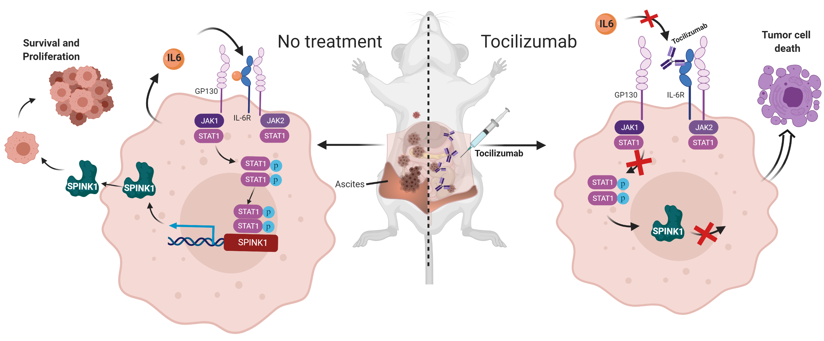 In our study we have found that Serine Protease Inhibitor Kazal type 1 (SPINK1), an endogenous inhibitor of trypsin-like serine proteases, is also an important regulator of anoikis resistance in OCCC. We have established a novel intraperitoneal metastatic OCCC mouse model where the tumors establish themselves on the internal organs. We show here that silencing of the SPINK1 gene significantly reduced metastatic lesions. Furthermore, we identified that tumor cell expressed interleukin 6 (IL6) increases tumor cell expression of SPINK1 through autocrine signaling. Our investigation included the evaluation of the IL6 receptor inhibitor Tocilizumab, and we showed that in vitro drug treatment reduces tumor cell survival, while in vivo drug treatment produces a significant reduction of metastatic lesions in peritoneal organs, as well as a reduction of tumor associated ascites.