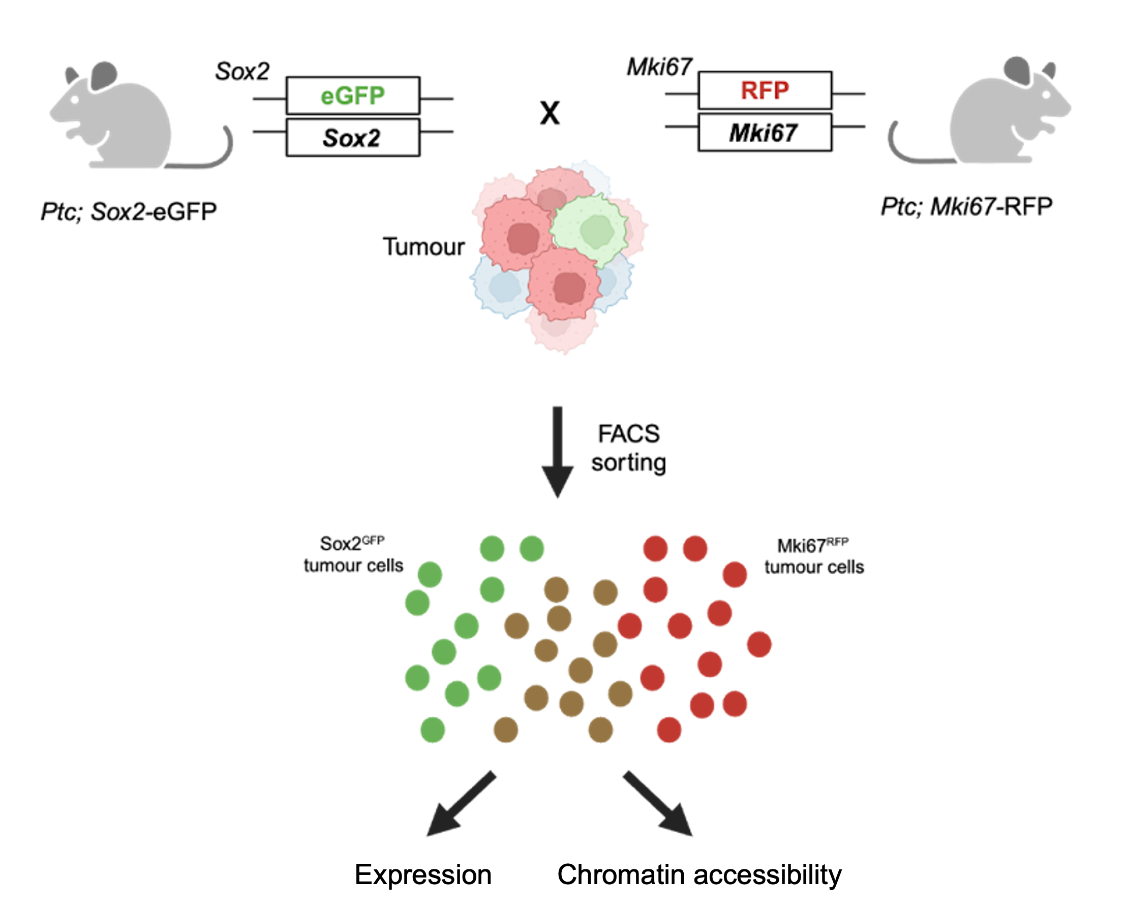 To investigate what drives stem cells from quiescence to activation, we employed whole-genome approaches in mouse SHH-MB tumours in which the relevant cellular markers were tagged with distinct fluorescent proteins. The GFP+ SOX2+ stem cell population was sorted into proliferative RFP+ (MKI67+) and quiescent RFP– (Mki67–) subpopulations for downstream analyses (Fig. 2).