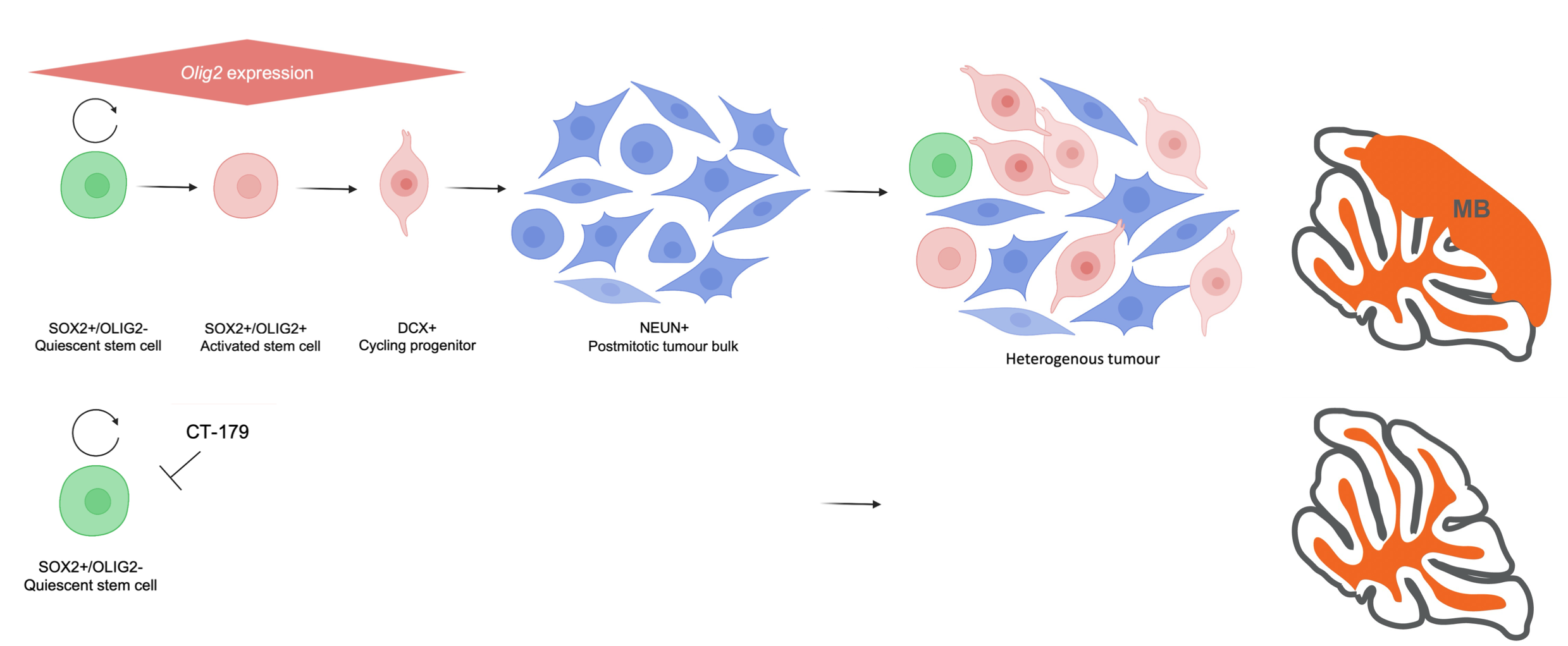 Inhibiting OLIG2 in our SHH-MB mouse model yielded striking results. By targeting OLIG2 in mice prone to SHH-MB during pivotal phases of tumorigenesis (tumour initiation or immediately following anti-proliferative “debulking” therapy), we effectively disrupted the transition from quiescent stem cells to proliferative stem cells and proliferative progenitors, constraining or “caging” stem cells in their quiescent state, and halting tumour progression (Fig. 3). This proof-of-concept demonstrated that stem cell fate transitions are essential, not incidental, to tumorigenesis in medulloblastoma, and perhaps other tumour types as well. Interestingly, treatment of fully formed tumours alone is insufficient to treat the tumour and prolong survival of mice because the large proliferative population drive tumour mass expansion and kills the animals. This suggests that targeting stem cell activation during critical windows are key to mitigate the uncontrolled proliferation of downstream tumour progenitors.