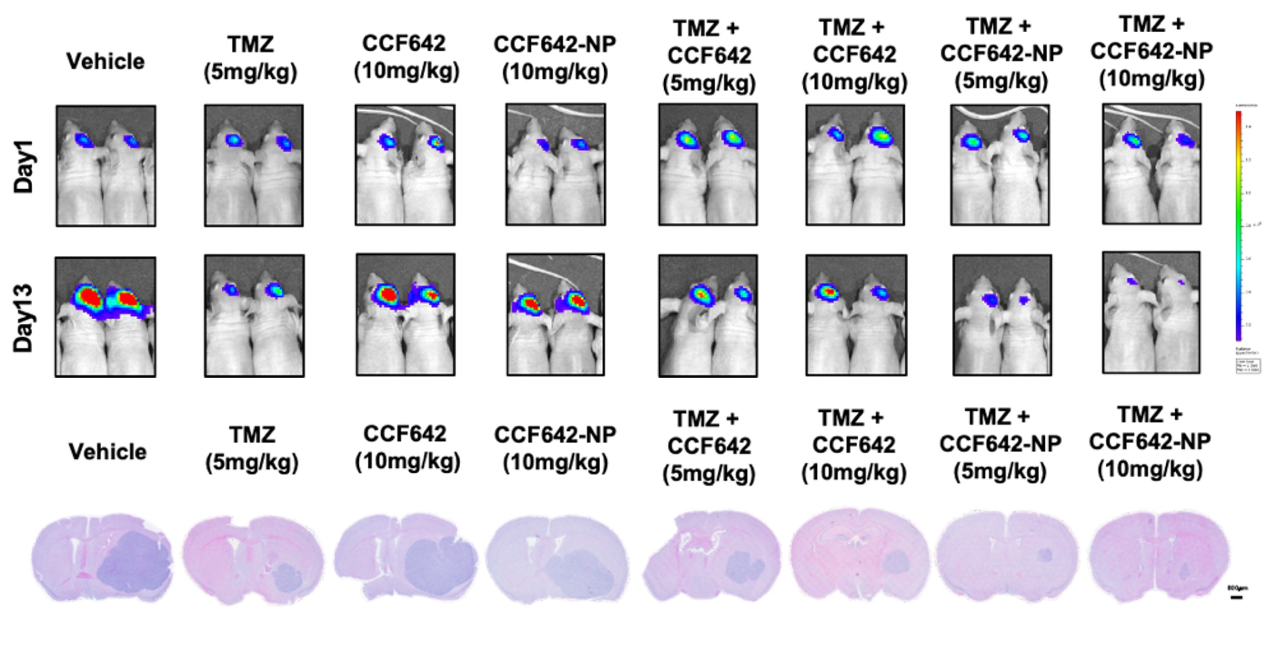 We found that PDI inhibition (CCF642 without any formulation) alone did not exert any anti-tumour effect in TMZ-resistant tumour (U87-R), whereas the nanoformation of PDI inhibitor (CCF642-NP) shrank the tumour compared to the vehicle control, suggesting that PDI inhibitor itself might have failed to reach the target site due to low solubility and poor drug delivery. Moreover, when given in conjunction with TMZ, CCF642-NP further suppressed tumour growth, either at a low or high dose.