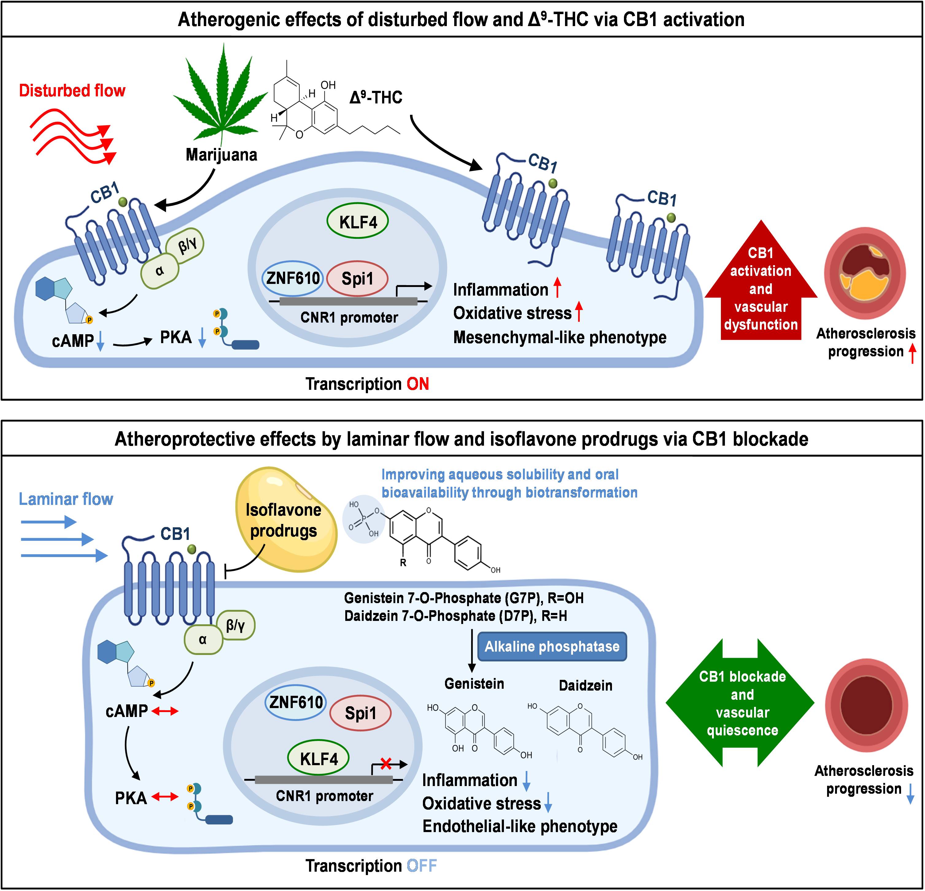 In the present study, CB1 was found to be markedly upregulated in human and murine atherosclerotic lesions, as well as in endothelial cells exposed to disturbed flow. This upregulation was driven by transcriptional regulation involving KLF4, Spi1, and ZNF610. The researchers also identified daidzein, an abundant soy isoflavone, as a previously unrecognized CB1 antagonist. To improve pharmacokinetic properties, monophosphate prodrugs of genistein and daidzein, genistein 7-O-phosphate (G7P) and daidzein 7-O-phosphate (D7P), were developed. Pharmacological or genetic inhibition of CB1 reversed disturbed flow induced endothelial inflammation, oxidative stress, and endothelial to mesenchymal transition, while oral administration of G7P and D7P significantly reduced atherosclerotic plaque formation in mouse models.