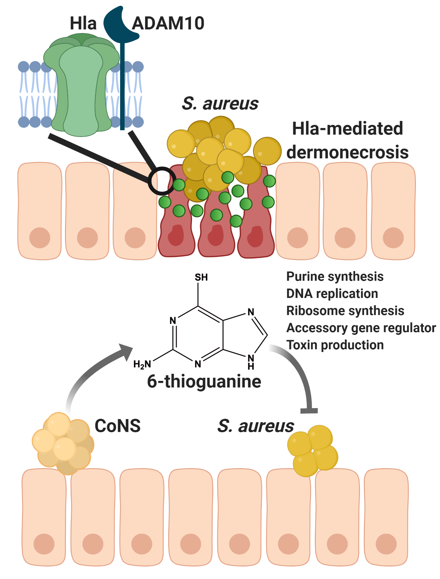 With these results in hand, we were curious as to whether we could use 6-TG as an antimicrobial, or anti-virulence compound, against S. aureus skin infection. Strikingly, physiologically relevant amounts of the pure compound significantly reduced skin damage caused by S. aureus. To elucidate the mechanism of action, we used RNA-seq to determine the changes that 6-TG was exerting on S. aureus and found that it exerts many effects on the pathogen. First, it blocks de novo purine biosynthesis, thereby preventing DNA replication and bacterial growth. Moreover, it reduces transcription from genes encoding for the global virulence regulator agr and for ribosome synthesis, resulting in a significant reduction in toxin production.