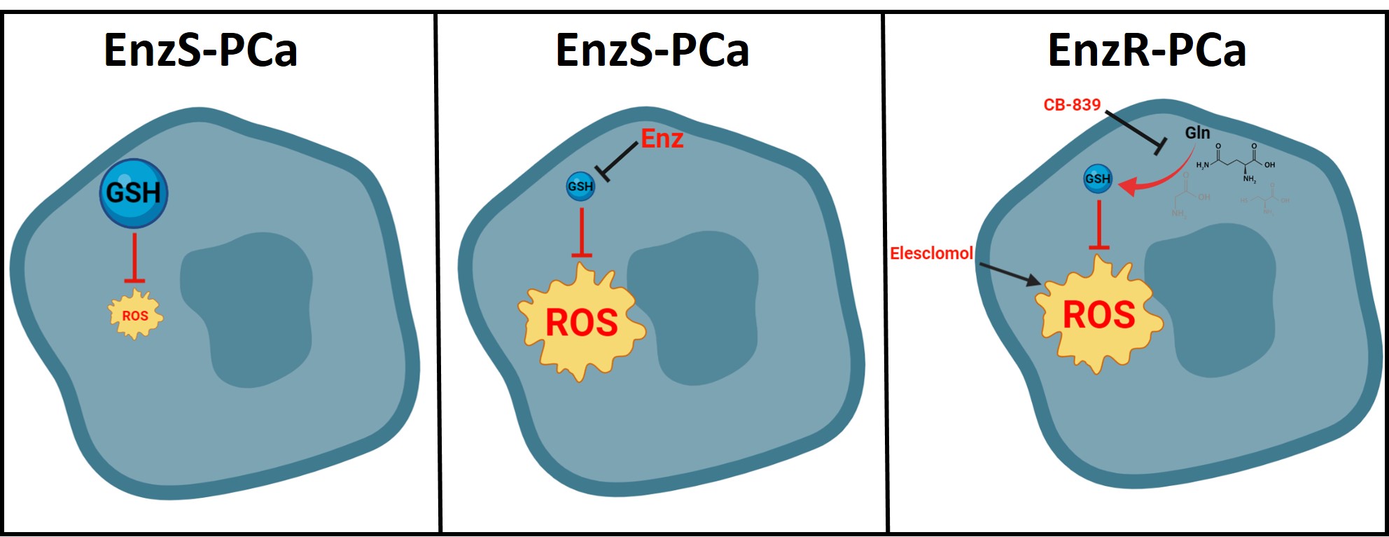 Herein, we identified that enzalutamide induces oxidative stress by blocking androgen receptor-regulated glutamine and antioxidant metabolism genes. Enzalutamide-resistant prostate cancers are characterized by higher basal and inducible levels of reactive oxygen species. Using comparative unbiased metabolomics in paired enzalutamide-sensitive (EnzS) and EnzR-PCa cell lines, we noted that antioxidant pathways driven by glutamine metabolism were dramatically enhanced in EnzR-PCa cell lines. We postulated that the enhanced antioxidant pathways enable these enzalutamide-resistant prostate cancers to tolerate higher levels of oxidative stress, and that this dependency represents a targetable vulnerability. In support, we demonstrated a greater sensitivity of enzalutamide-resistant prostate cancers to agents that increase oxidative stress or block antioxidant pathways. We have specifically shown that either small-molecule inhibitors or genetic ablation of key enzymes involved in either glutamine or ferredoxin metabolism significantly slow the growth of enzalutamide-resistant prostate cancers.