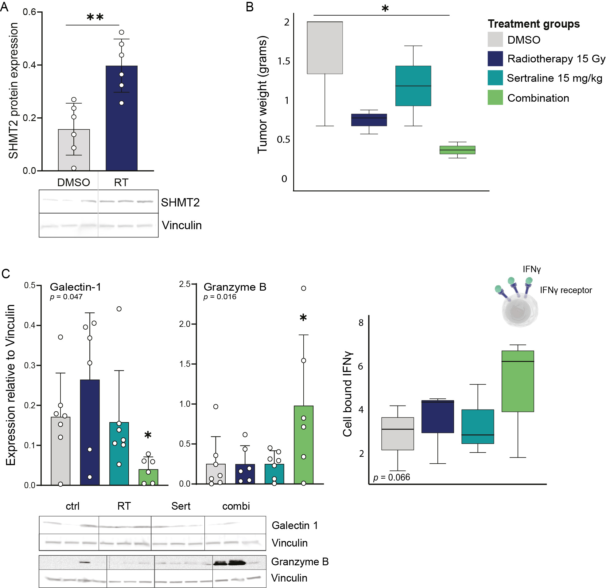 Figure 4. A) SHMT2 protein expression on day 17 measured by immunoblot in n=3 LLC tumors and n=2 technical replicates. An unpaired two-tailed t test has been used to compare DMSO treated mice and irradiated tumors. B) Box plot showing tumor growth as tumor weight in the different treatment groups: DMSO, RT 15 Gy, sertraline 15mg/kg, and combination. Kruskal-Wallis test with a Dunn's multiple comparisons test was performed. C) Galectin-1 and granzyme B protein expression measured by immunoblot in the tumors of n≥3 mice for each treatment group and n=2 technical replicates. A Jonckheere-Terpstra test was performed. Box plot showing the % of cell bound IFN-γ measured by flow cytometry in dissociated tumors collected from mice treated with DMSO, RT, sertraline, and combination treatment. Statistical analysis *p-value < 0.05, **p-value < 0.01.