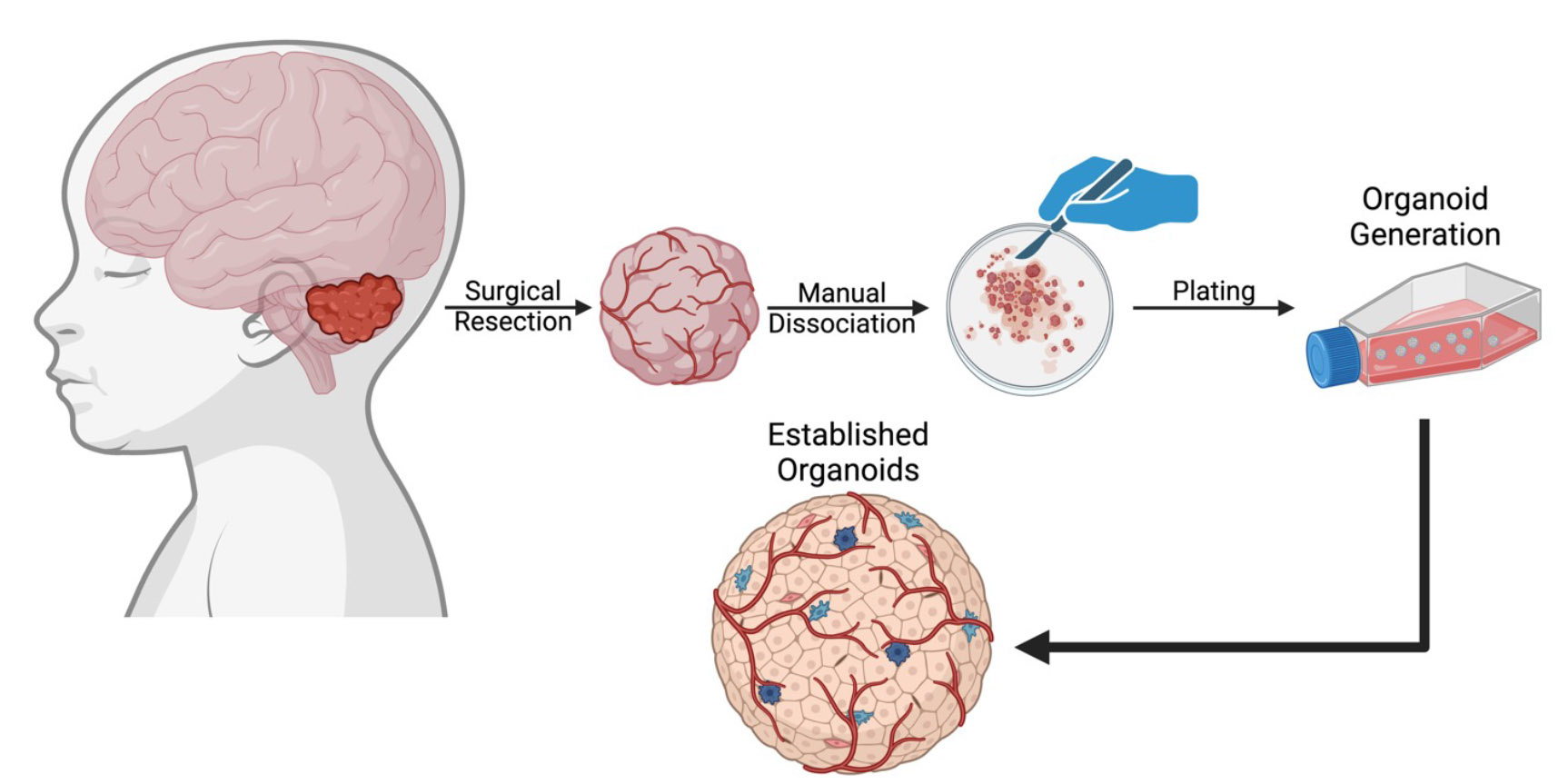 Figure 2: Medulloblastoma organoids generated from fresh patient tumor tissue retaining tumor heterogeneity. Medulloblastoma organoids were generated directly from fresh tumor tissue surgically resected from patients, without cell dissociation. These organoids have heterogeneous morphology, vascular structures, and proliferative and stem cell populations.