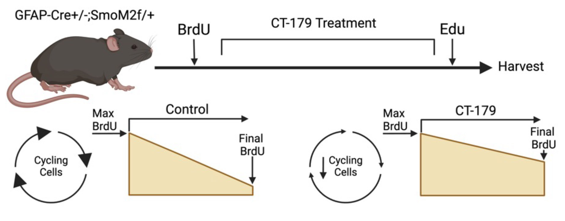Figure 3: Labeling tumors with BrdU and Edu DNA binding agents permits investigation of cell cycling over the course of treatment with CT-179. In a GFAP-Cre/SmoM2 mouse model of medulloblastoma (MB) driven by a mutant Smoothened allele, constitutive SHH-pathway activation results in spontaneous medulloblastomas that resemble patient tumors. BrdU administered prior to treatment labels all cycling cells. Administered at the end of treatment, EdU marks cells still proliferating. OLIG2 marks CSCs and oligodendrocytes, and SOX10 distinguishes oligodendrocytes from CSCs.