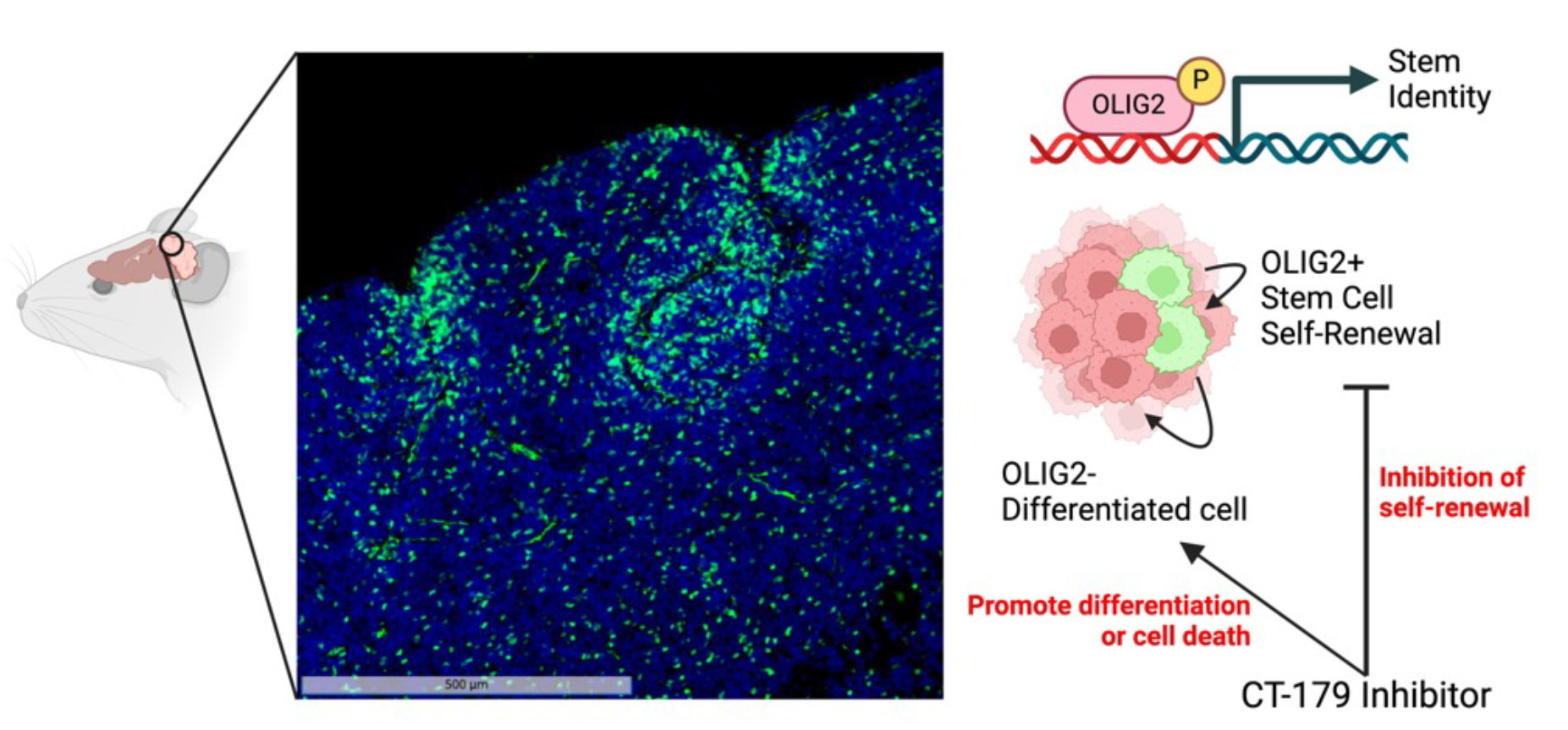 Figure 1: Transcription factor OLIG2 as a targetable regulator of stemness. In a mouse model of medulloblastoma, OLIG2+ stem cells are immunostained green, with all nuclei labeled blue (DAPI). These OLIG2+ cells divide slowly to renew their population and to generate rapidly proliferative daughter cells that contribute to the bulk of the tumor. We hypothesized that OLIG2 not only marks the identity of these cells but also controls their tumorigenesis, and that inhibiting OLIG2 would reduce their tendency to generate active tumor cells.