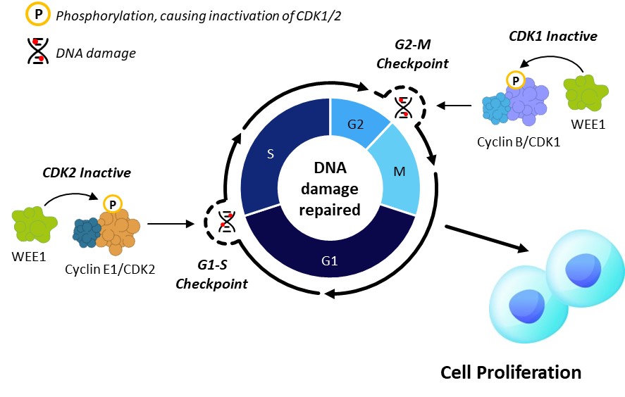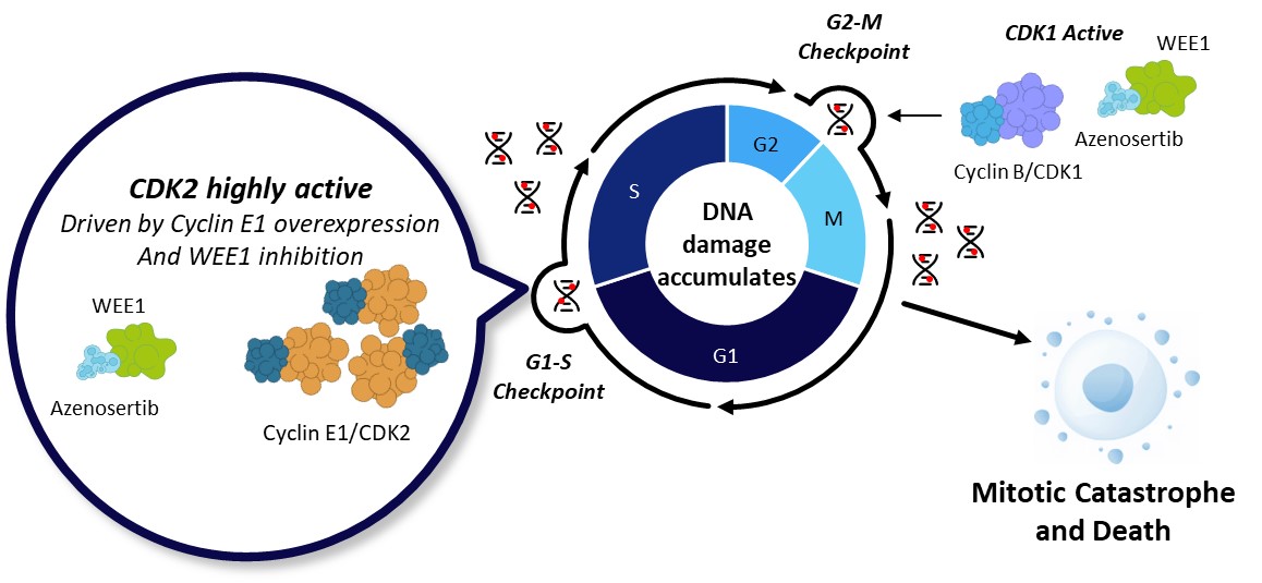 In many cancers, particularly gynecological cancers, Cyclin E1 is overproduced, leading to an overactive Cyclin E1/CDK2 complex. This speeds up the cell cycle and can cause problems because cells do not have sufficient time to repair damaged DNA generated from a regular replication cycle or exogenous stimuli. As a result, these cancer cells become highly dependent on the G2/M checkpoint to manage and enable repair of DNA damage, creating a potential vulnerability to drugs targeting this checkpoint.