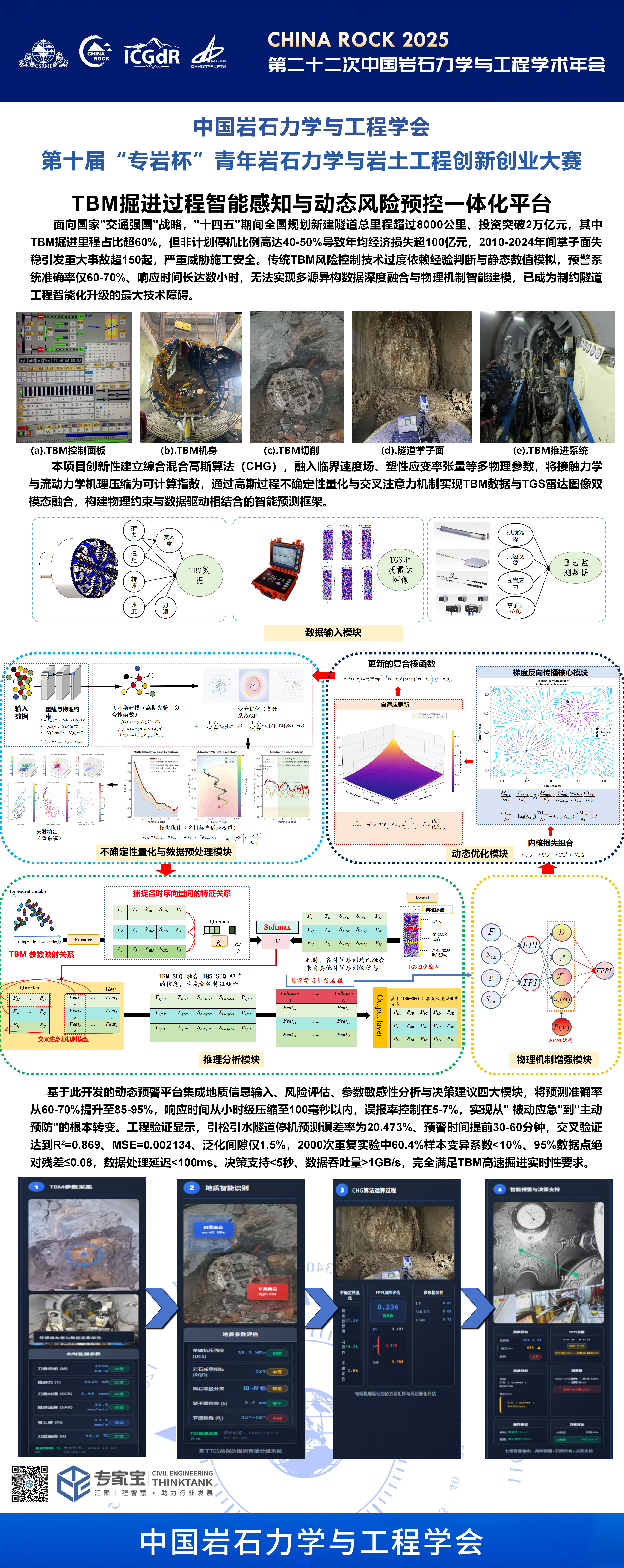 Therefore, this project innovatively establishes a Comprehensive Hybrid Gaussian (CHG) algorithm, achieving breakthrough fusion of Gaussian process uncertainty quantification with cross-attention mechanisms, realizing a major technical breakthrough in TBM dual-modal dynamic early warning control. The project proposes for the first time the Failure and Performance Prediction Index (FPPI), deeply integrating the contact mechanics and fluid dynamics mechanisms in the TBM tunnel face cutting process, constructing an intelligent prediction framework combining physical constraints with data-driven approaches. The TBM tunneling dynamic early warning platform developed based on the CHG algorithm integrates TGS advanced geological radar prediction with real-time tunnel face image recognition, achieving a fundamental transformation from "passive emergency response" to "proactive prevention."