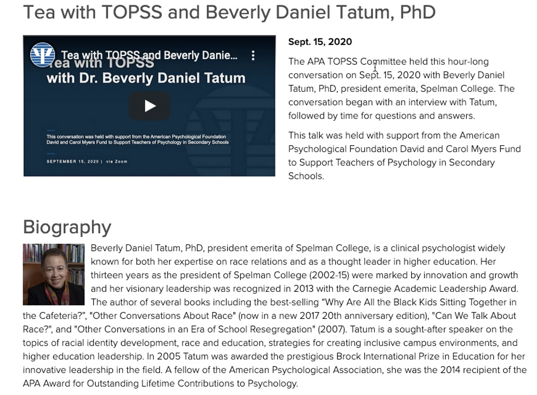 Here’s the latest example: “Tea with TOPSS and Beverly Daniel Tatum, PhD”