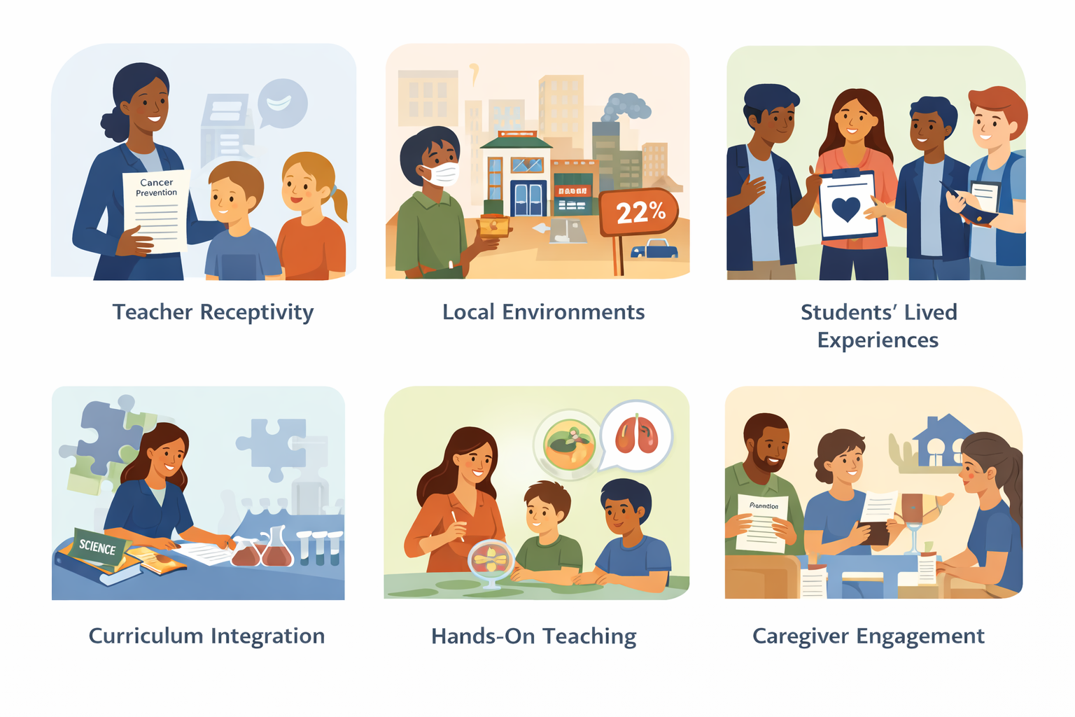 Adolescence is a critical window for cancer prevention. It’s when lifelong behaviors begin to form and when environmental and social exposures can have lasting biological effects. Yet studies consistently show that adolescents have low awareness of cancer risk factors, particularly those tied to social and environmental conditions. Schools are among the few settings where we can reach nearly all adolescents—but only if what we introduce is feasible, relevant, and sustainable. Rather than designing a curriculum in isolation, we partnered with: