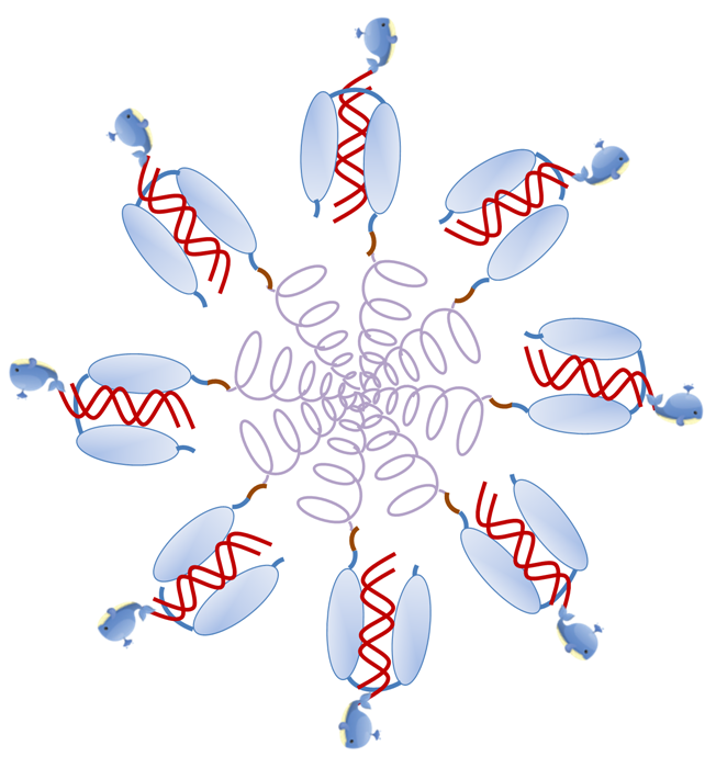 For tricks that natural proteins don’t have, such as endosomal disruption, non-natural peptides were added to the overall architecture, and they were added in specific way. To avoid potential immune responses (e.g. recognition by antibodies), the non-natural peptides were embedded in the protein core. Based on this idea, a model ribonucleoprotein octamer (Figure 1) with all the desired features such as compact size, high payload, absence of cationic surface charge, colloidal stability, binding specificity, and biocompatibility, was constructed and applied to cancer therapy.