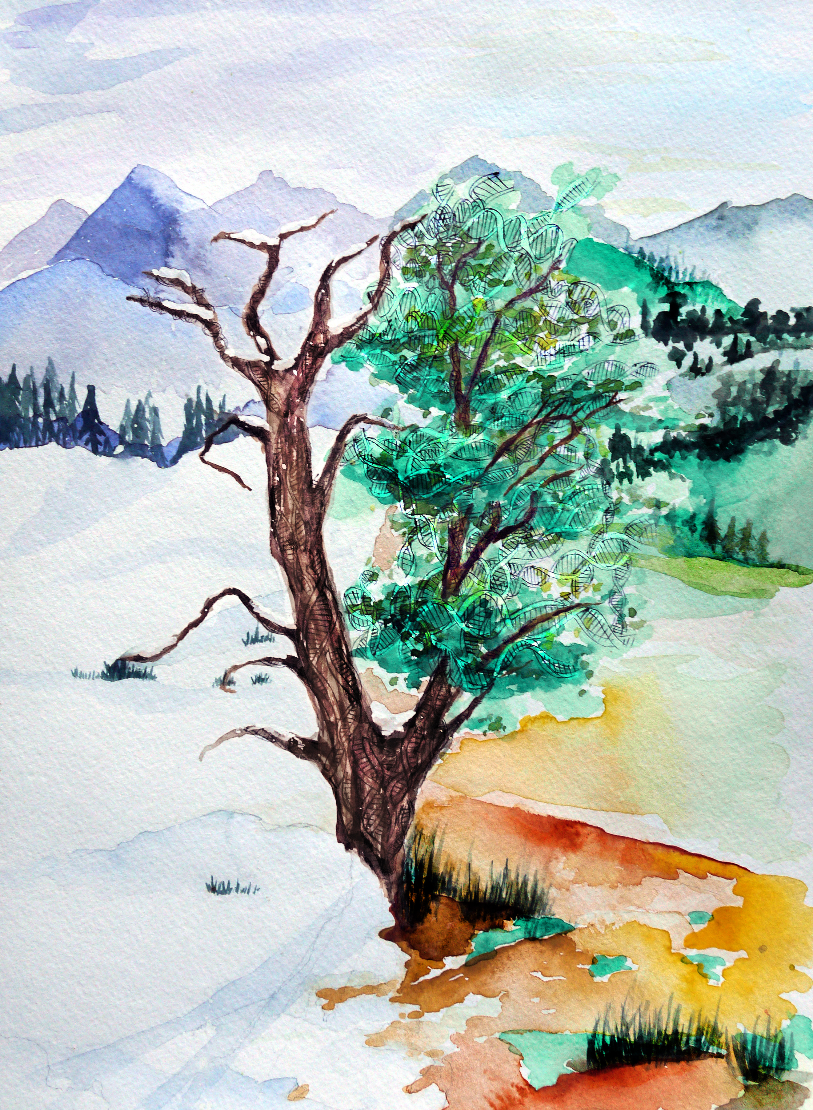FIgure 1: When using the blocker displacement amplification (BDA), DNA variant molecules ‘grow’ at a much faster speed in PCR than wildtype molecules, like tree branches growing in different seasons. The tree represents the exponential amplification of PCR/BDA (both via branching leaves and as an organism that actually grows). The left and right sides of the tree both grow despite the different temperatures, representing the temperature robustness of the BDA amplification.