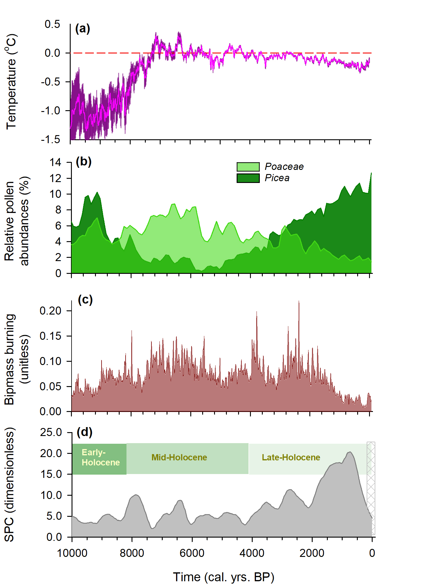 Les dynamiques de la végétation ont également subi des changements significatifs, passant de forêts boréales mixtes de type fermé à des écosystèmes de friches de chênes-pins et revenant à des types boréaux sur des millénaires (Figure 2). Ces changements ont été marqués par des fluctuations dans les abondances relatives des genres de pollen, reflétant des changements climatiques et environnementaux plus larges. En particulier, une tendance notable au réchauffement vers 7 500 ans calibrés avant le présent s'est intensifiée avec une pente relativement raide (+0,11˚C par siècle) et a persisté jusqu'à environ 7 000 ans cal. BP (Figure 2). Ce changement crucial a été parallèle à l'augmentation de la combustion de la biomasse et a vu la forêt boréale passer à un écosystème de friches de chênes-pins pendant environ 2 000 ans avant de revenir, alors qu'une tendance au refroidissement progressif se produisait, juste avant le réchauffement observé dans les relevés.