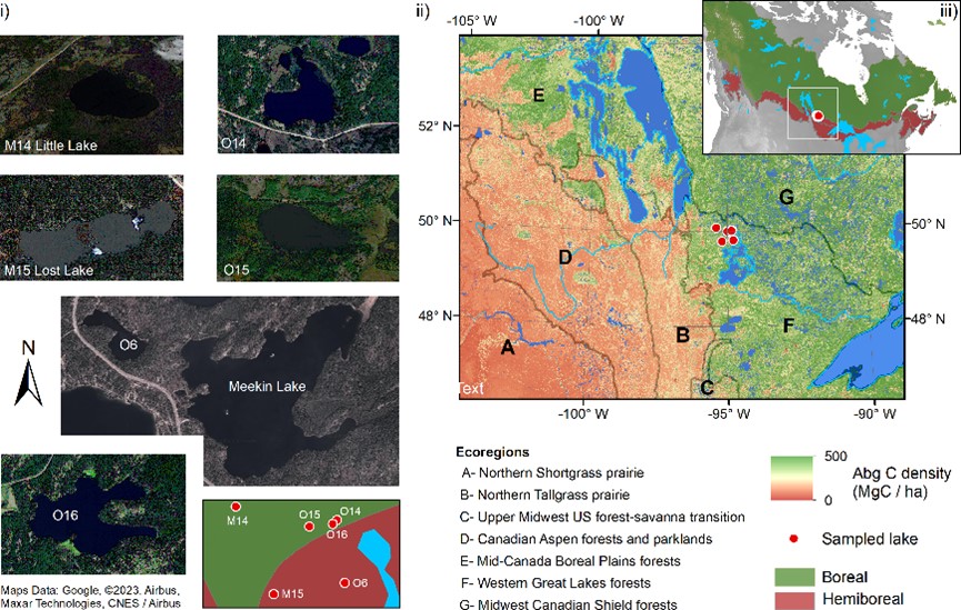Figure 1. La zone d'étude, située dans la région du lac des Bois le long de la frontière entre les provinces du Manitoba et de l'Ontario au Canada, a été examinée en prélevant des sédiments dans six lacs (i). Les carottes ont été prélevées dans des colonnes d'eau atteignant des profondeurs de 1,2 m à 8,3 m. Les longueurs des carottes sédimentaires des six lacs échantillonnés étaient en moyenne de 614 cm, allant de 247 cm pour le lac M14 à 818 cm pour le lac O16. Les âges au fond des carottes ont atteint plus de 10 000 ans calibrés avant le présent (cal. années BP, c'est-à-dire CE 1950) pour les lacs M15, O6, O14 et O16. Les étendues des zones boréales et hémiboréales sont illustrées dans la carte en encart en haut à droite (iii). La palette de couleurs sur la grande carte (ii) montre la densité de carbone en surface en 2010, ainsi que les limites des écorégions.