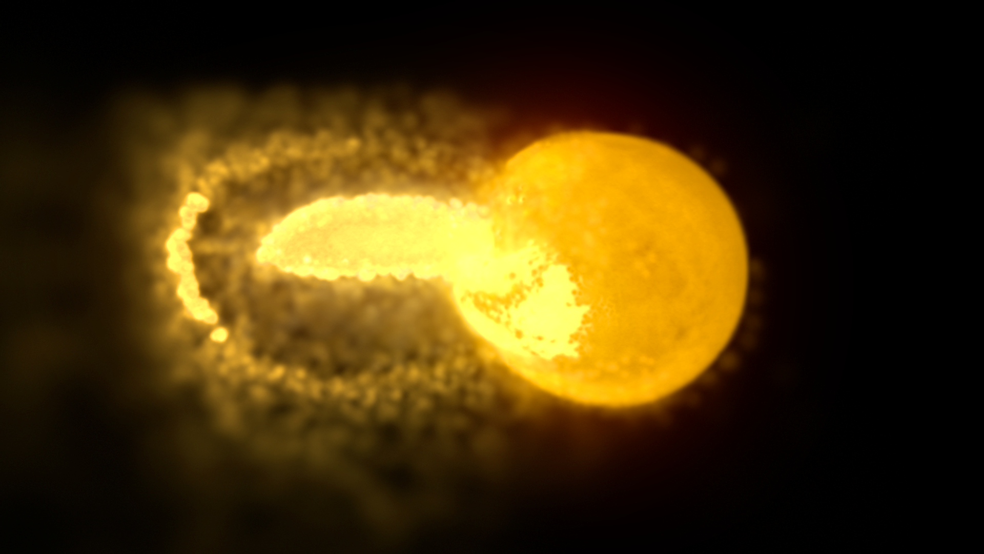 For a long time, people have speculated the origin of the Moon. To date, several models for the origin of the Moon have been suggested, e.g., fission, capture and binary formation models. Amongst these candidates, a collision between two planetary embryos, so-called "the giant impact (GI) hypothesis", has been recognised as the most favourable scenario for the formation of the Moon. According to this scenario, in the late stage of the Earth formation, a Mars-sized body collided with the proto-Earth and ejected materials to the orbit, which was later accumulated into the Moon. This hypothesis can explain almost all of the evidence of the current Earth-Moon system, e.g., a lack of iron core in the Moon, the angular momentum in the Earth-Moon system, and so force. Numerical simulations have also supported this scenario and made it a de facto standard scenario. The following figure shows one snapshot of our paper.