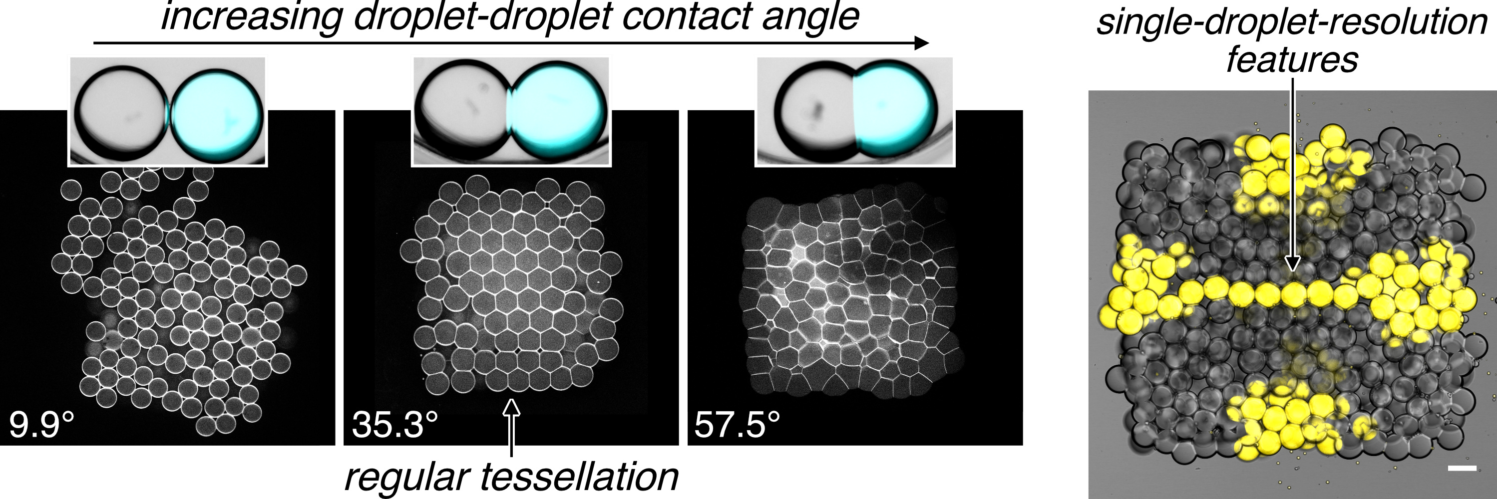 Studying 3D tessellation of printed droplets required advanced imaging and image analysis techniques. Key to understanding how the droplet-droplet interactions affected the arrangement of hundreds of cell-like compartments was to develop an in-house image analysis algorithm based on Delaunay triangulation12 which gave us a quantitative measure of tessellation regularity as foundation for our systematic study.