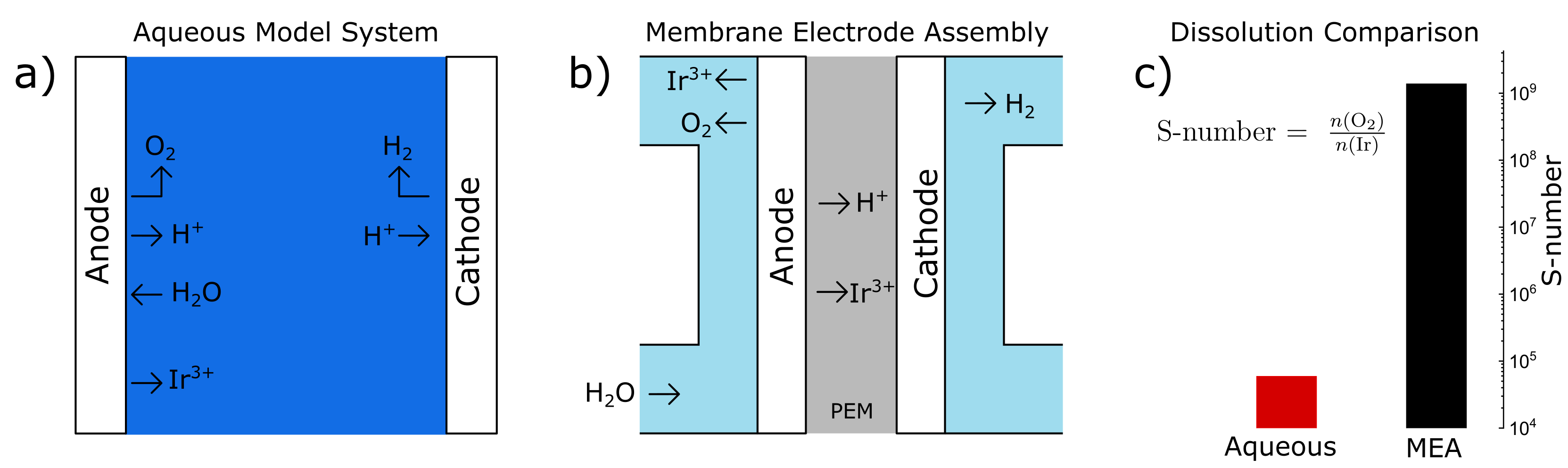 In our work On the limitations in assessing stability of oxygen evolution catalysts using aqueous model electrochemical cells, we put the widespread practice of testing OER electrocatalysts in AMS under scrutiny. We developed an MEA setup specifically designed to determine the actual catalyst dissolution rates, avoiding potential errors from catalyst redeposition across the testing setup by galvanic replacement. The results were compared against stability measurements in our scanning flow cell coupled to an inductively coupled plasma mass spectrometer (SFC-ICP-MS), an established AMS. For an identical iridium oxide catalyst, we observed a huge stability discrepancy of several orders of magnitude between AMS and MEA, as shown in Figure 1 c) when employing the S-number as an electrocatalyst stability metric [3].