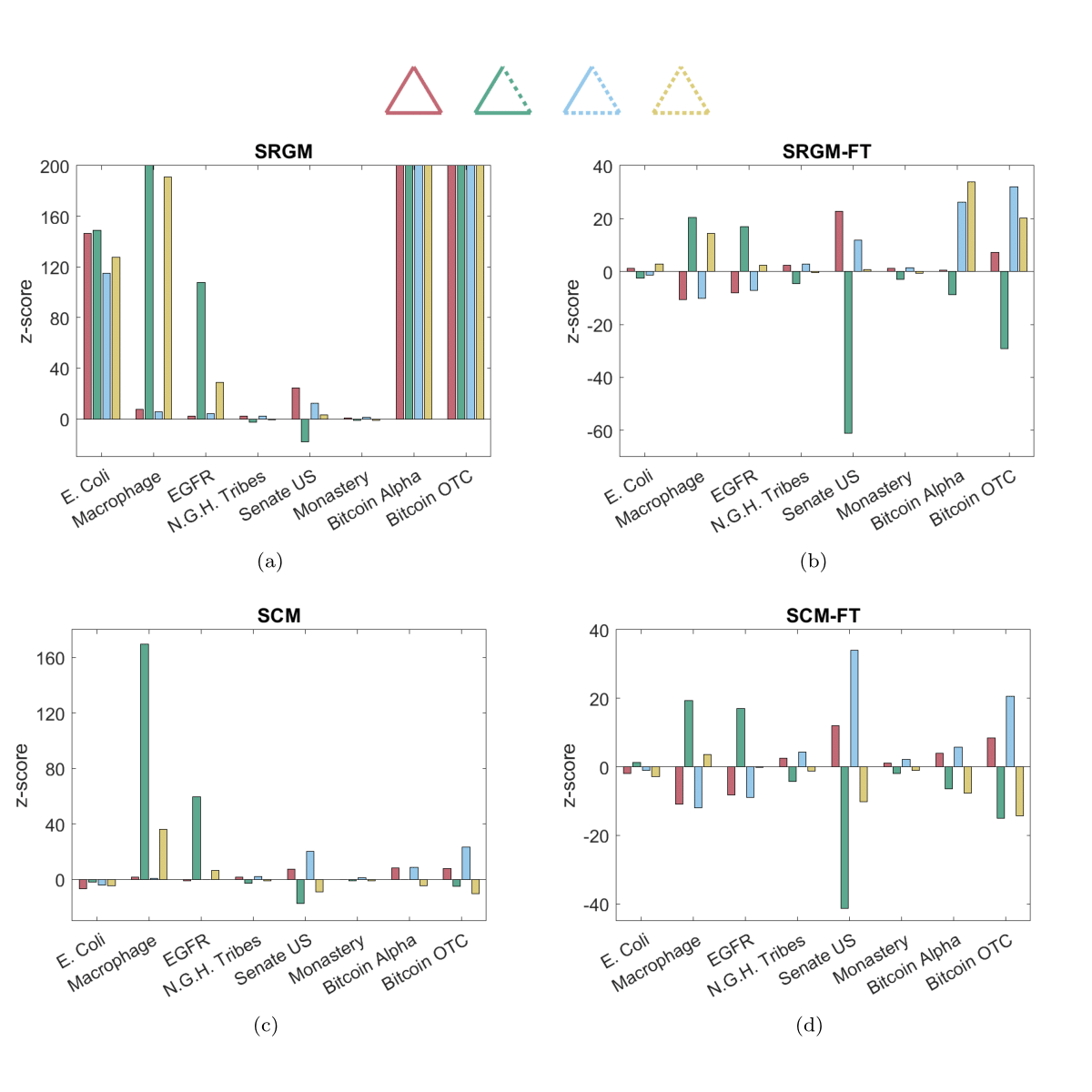 After providing a unified, theoretical framework for analyzing binary, undirected, signed networks, we employ it to evaluate the empirical abundance of the aforementioned, triadic patterns from a statistical perspective. As figure 1 shows, our analysis of three, socio-political networks (N.G.H. Tribes, Senate US, Monastery) and two, financial networks (Bitcoin Alpha, Bitcoin OTC) leads to the following conclusion: i) null models induced by global constraints tend to favour the weak variant of the balance theory, according to which only the triangle with one, negative link (depicted in green) should be under-represented in real-world networks; ii) null models induced by local constraints tend to favour the strong variant of the balance theory, according to which the triangle with three, negative links (depicted in yellow) should be under-represented as well. Instead, biological networks (E. Coli, Macrophage, EGFR) seem to be characterised by a marked tendency towards imbalance.