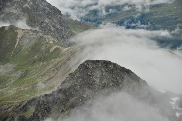 Two summit botanists on Chlein Schwarzhorn, as seen from Flüela Schwarzhorn, in 2010 (Photo: SLF/Cajsa Nilsson)