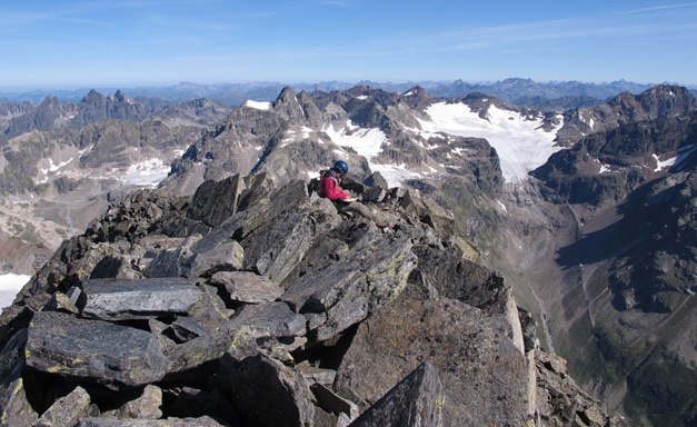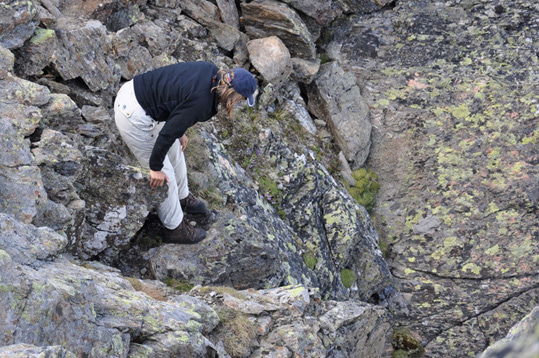 Summit botanist on Piz Linard (Photo: SLF/Hansueli Rhyner, 2013).