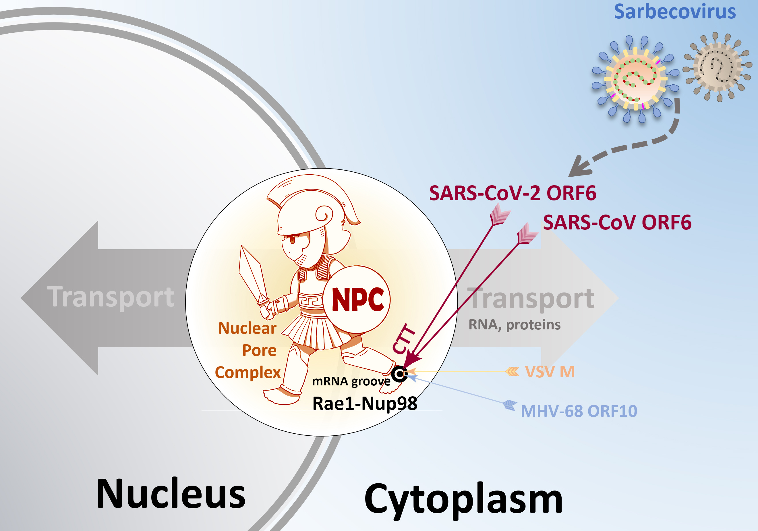 To shed light on the action of ORF6 during infection, we determined the crystal structures of Rae1-Nup98 (a component of the nucleopore complex, NPC) complexed by the C-terminal tails (CTT) of SARS-CoV-2 and SARS-CoV ORF6 respectively. We found an invariant methionine M58 of ORF6 CTT extends its side chain into a hydrophobic cavity in the Rae1 mRNA binding groove, resembling a bolt-fitting-hole; hence we call it “M-cavity”. Intriguingly, vesicular stomatitis virus (VSV) matrix protein (M) and herpesviruses MHV-68 ORF10 both target the M-cavity in Rae1 with their special methionines, VSV-M M51 and MHV-68 ORF10 M413. It is possible that the Rae1 M-cavity is the “Achilles heel” of the NPC, and this weakness is exploited by a variety of viruses (illustrated below).