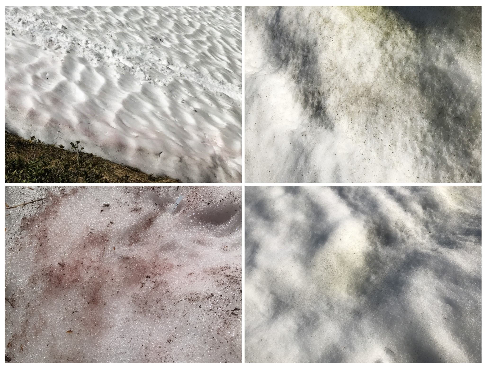 Figure 3. Red-colored (left side) and green-colored (right side) snowfields as typically found in the Central Alps during snow meld in spring. The distinct color of each snowfield type is attributable to algal pigments. Photo credit: Armin Erlacher