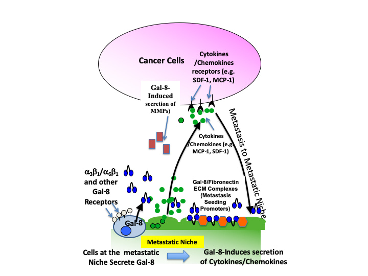Given that tumor growth and metastasis are regulated by chemokines and pro-inflammatory cytokines it was obvious to determine whether gal-8 promotes chemoattraction of cancer cells toward target tissues via its effects on SDF-1 and MCP-1 secretion. Indeed, we could show that cytokine and chemokine secretion, induced by gal-8, promotes migration of cancer cells toward cells treated with this lectin. Accordingly, gal-8 KO mice experienced reduced tumor size and smaller and fewer metastatic lesions when injected with cancer cells.