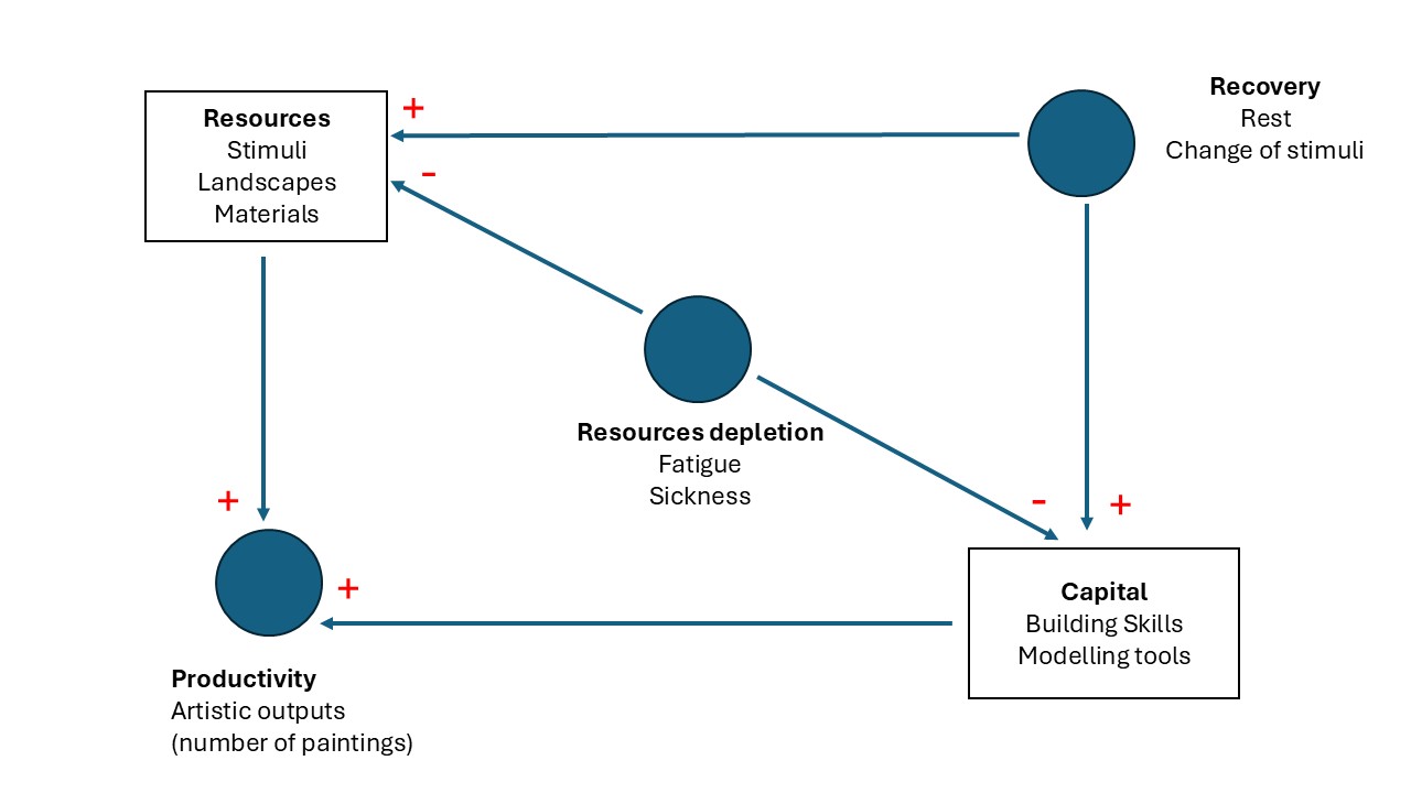 A simplified causal diagram of Van Gogh’s creative process as an adaptive system. Blue circles indicate physical, cognitive, and emotional resources; rectangles represent accumulative stocks influenced by internal and external factors such as artistic inputs or tools. Feedback loops between these elements drive or diminish creativity over time.