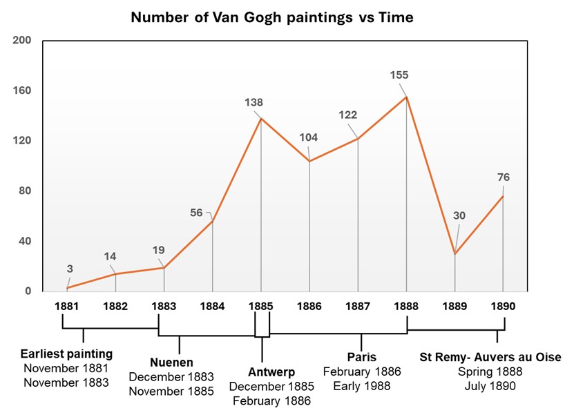 Van Gogh’s painting output over time. The first surge in productivity occurred in 1885, when he explored the colour theories of Blanc and Chevreul. The second, in 1888, corresponds to his use of the “box of yarn,” which inspired canvases with textures reminiscent of woven fabrics.