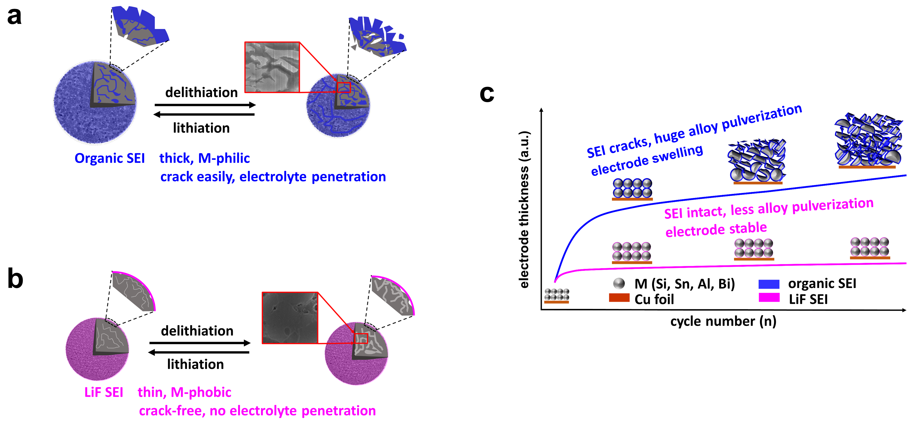For commercial carbonate-based electrolytes, it is very challenging to achieve efficient electrochemical reversibility on alloying anodes due to the inevitable cracks of both alloy particles and organic SEI during the repeated charge/discharge cycles (Figure 1a). A more robust SEI is required to accommodate the large stress and volume change of the alloying anodes for long-term cycle performance (Figures b-c).