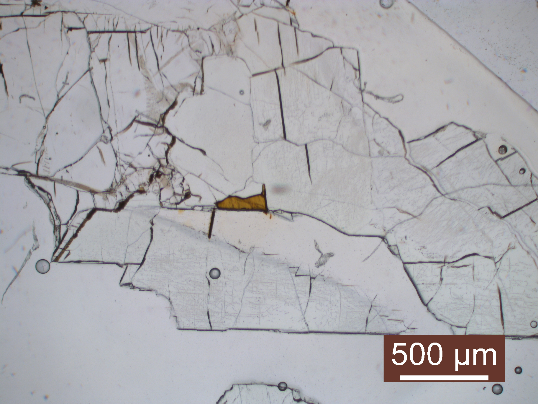 A plane polarised light optical image of the "monster" baddeleyite grain found in Apollo troctolite 76535.